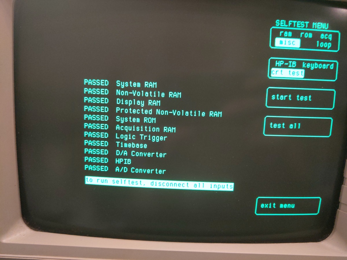 Hier wie gewünscht die Bilder vom Selbsttest und allen Menüfunktionen. Ich habe die Selbstkalibrierung durchgeführt laut Serviceanleitung. Alle Kanäle funktionieren (kann ich bei Bedarf auch Fotos machen). Den Monitor habe ich nach der Serviceanleitung ebenso neu eingestellt. Besonders gut gefällt mir an dem Oszi die Triggereinstellungen. AV Video Signale lassen sich z.b 1A darstellen (selbst probiert). Die Menüführung ist quasi selbst erklärend. Mathefunktionen gibt es auch allerhand. Standort zur Abholung: Görlitz