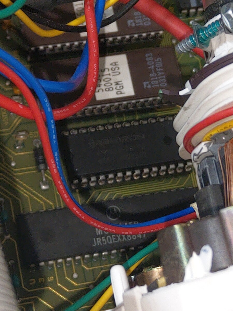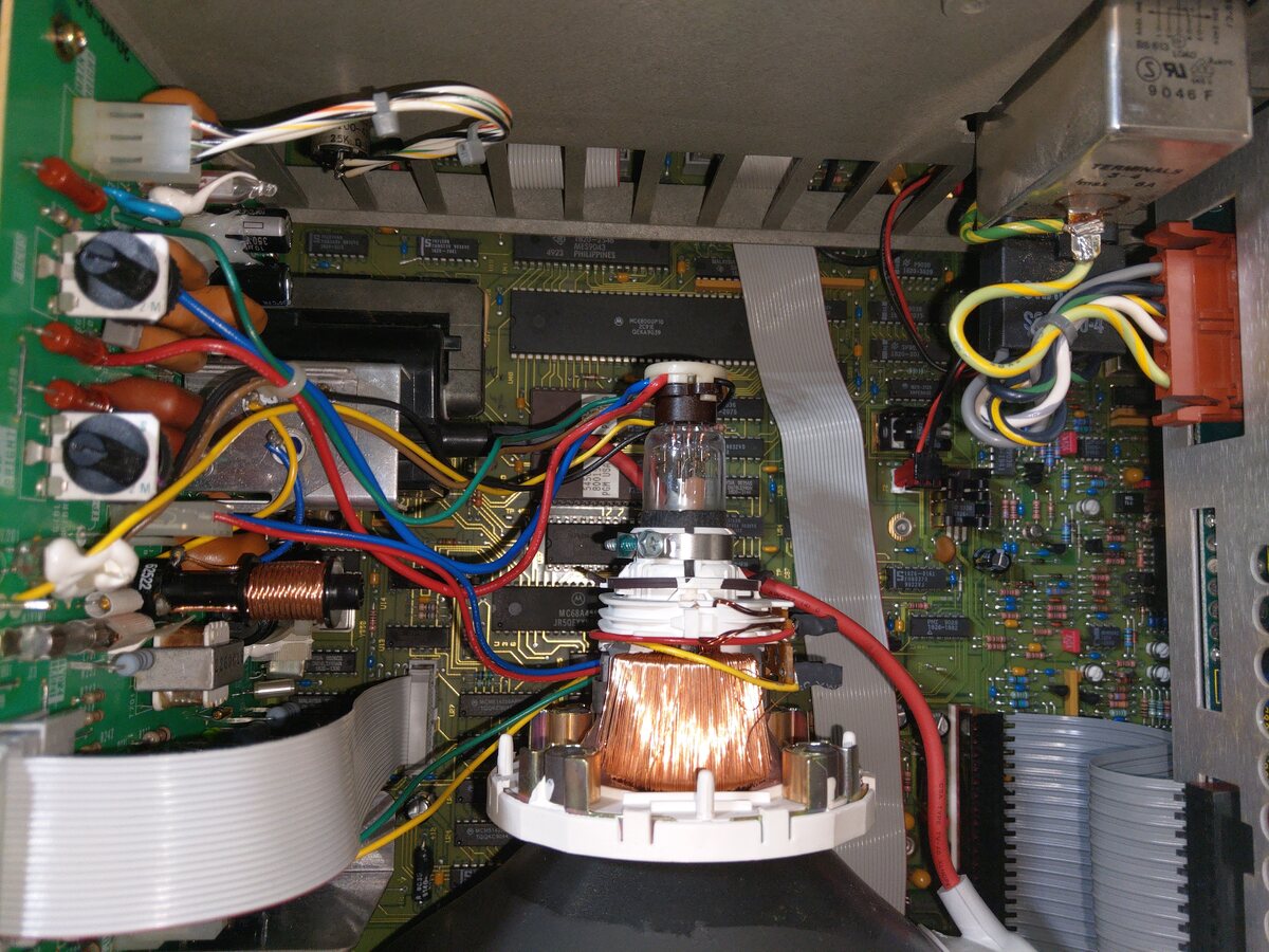 Die Schriftfarbe ist ehern gelb. Leider lässt sich das nicht wirklich mit mein Handy aufnehmen. Die Bildröhre ist voll intakt (scharfe Schrift, nichts eingebrannt). Hier noch ein kleiner Einblick in den Innenraum, sowie ein Foto von den neu eingebauten Ramtron FRAM.