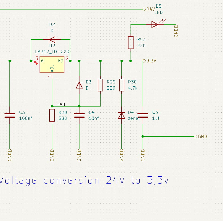 Hallo, ich habe gerade festgestellt, dass mein LM317 ab einer gewissen Zeit die Spannung erhöht. Eingang 24V, gewünschter Ausgang 3,3V. Über Nacht habe ich bereits meinen Mikrocontroller wohl durch Überspannung verloren. Ich habe dann heute morgen die Ausgangsspannung im Auge gehabt und nach einigen Minuten steigt sie auf 4,9V. Der Laststrom liegt in etwa bei 30mA, der LM317 ist kalt. Wobei ich gestern schon festgestellt habe dass er schon bei 80mA wahnsinnig heiß wird. Ich sehe gerade jetzt sinds sogar schon 6,5, der Mikrocontroller ist damit wohl wiede hin. Ich habe den Adjust Pin nochmal nachgelötet, was nichts gebracht hat. Mikrocontroller und LM317 ersetzen bringt ebenfalls nichts. Kann es sein dass ein Chinesischer Clone wirklich so schlecht ist? Es gibt ein Youtube Video, dass dies behauptet und auch die schlechten Rezensionen bei Amazon lassen das vermuten. Ich bin jetzt drauf und dran den rauszuschmeißen wollte nur vorher nochmal nachfragen ob es an meinem Schematic liegen kann? Die ZenerDiode soll wohl Drift haben, aber nicht so viel denke ich. Viele Grüße