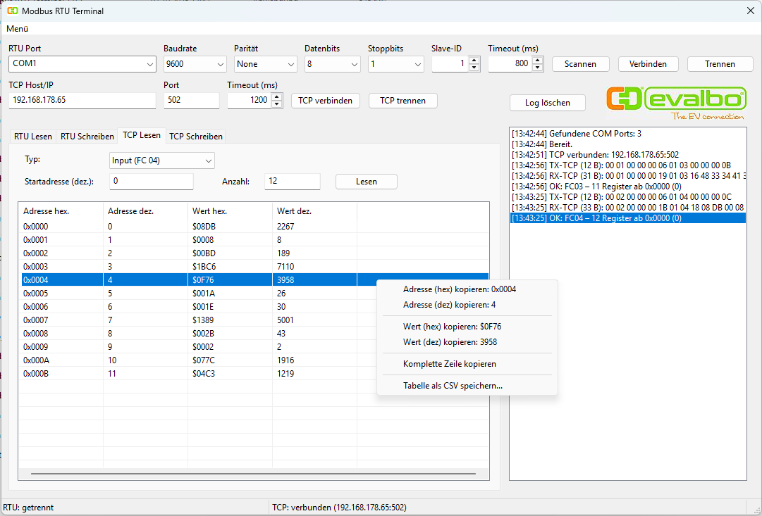 Zurück zum eigentlichen Thread. Habe das Programm mit Modbus TCP ergänzt. Es ist weiterhin sehr einfach gehalten. Die Tabelle mit den Registern kann nun kopiert oder als csv abgespeichert werden. :)