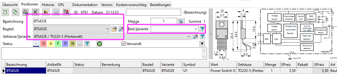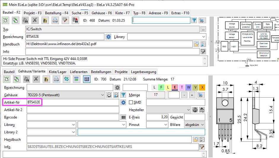 Beim Bauteil > Variante muss man im Feld "ArtikelNr" das "BTS432E" drin stehen haben, ansonsten findet EleLa nichts. (Bild1.png) Dann klapp auch der Import (Bild2.png) Jedoch die Spalte "Variant" bedeutet die Variante der Bestückung, wenn man nicht eine Platine herstellen möchte, die unterschiedliche Variationen hat mit unterschiedlicher Bestückung dann sollte man das Feld nicht nutzen. (Bild2.png, der rechte violette Rahmen) Dieser Import hat bei mir so funktioniert:
