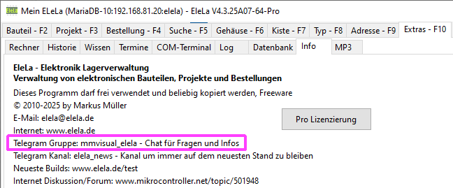 Es gibt eine Gruppe (siehe EleLa Extras-F10 > Info), da kann man rein kommen und Fragen stellen. Hier werden sehr oft neue Features angefragt und Lösungen diskutiert. Das tolle ist, dass diese App eine Übersetzen Funktion mit dabei hat. Ebenfalls erfährt man hier immer die Änderungen der neuesten Versionen. Der Haken: Wenn man neu rein kommt in die Gruppe und man nicht sofort was Sinnvolles schreibt (um EleLa), dann sperre ich jeden, so lange bis er mir eine Mail schreibt. Es kommen sehr viele rein und machen Werbung für dubiose Finanzgeschäfte (und sonstiges), einen Tag später ist es dann nur noch ein "Gelöschtes Konto". Setdem ich alle sperre habe ich ruhe. Zu gerne wüsste ich wie man einen Chat-Bot schreibt, damit könnte ich das automatisieren. Auf der gleichen Seite kann man mit "Übersetzung" EleLa übersetzen. Dabei unterstützt EleLa jeden der Texte übersetzen möchte mit vielen Hilfsmittel. Mit dem Fenster kann man bestehende Übersetzungen mit "Read Language File" importieren, z.B. die englische Übersetzung in die Spalte "EN". Alles was in der Spalte "Current" steht nimmt EleLa als Übersetzung aus der Datenbank. Damit haben alle Arbeitsplätze automatisch die gleiche Übersetzung. Viele EleLa User nutzen dieses Feature auch um einzelnen Spalten komplett andere Bezeichner zu geben, weil es ihnen in ihrem Arbeitsablauf besser passt. Wie EleLa die Übersetzung unterstützt: Beispiel: Ein Text gefällt einem nicht, dann kann man auf diesen TLabel mit Shift+Alt+Doppelklick die Übersetzung starten und man gibt hier einen anderen Bezeichner ein. Diese Änderung wird dann in der Spalte "Current" der Translate Tabelle gespeichert. Um mir die Übersetzung wieder zu schicken kann man diese mit "Write Language File" wieder exportieren.