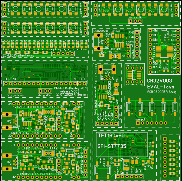 Nemopuk schrieb: > Matthias S. schrieb: >> Die leuchtet über den 1K-Widerstand wenn PC1 und PC2 H sind. > > Dafür ist sie falsch herum gepolt. Vielen Dank für die Aufmerksamkeit, ich habe sie tatsächlich falsch im Plan gezeichnet. Korrigierter Schaltplan hier im Anhang. Für diejenigen, die wissen möchten wie das funktioniert hier auch die Simulation dazu: https://www.falstad.com/circuit/circuitjs.html?ctz=CQAgjCAMB0l3BWcMBMcUHYMGZIA4UA2ATmIxAUgoqoQFMBaMMAKABkRs1OEUQUEhHnypUAZgEMANgGc61SO07cALCrz9BINRtEhJs+UkVhCfBGv4oVFS2AxC+AEzqSArlIAuDKXSfgoQJh0FgAnWxsUPA0LG2xeQLB4FgB3CPAHdNNRVJAMbnshfKpsqBZTPmKMou4Ua34QF3cvHz8AvWDIFFzY8EIqKtLFACU8vBtCsYmooO1aWZgEMKn+fBXcGxLkipBoksy9q0jG1wkPb19-CA7YLtyMcbmBx42y-we4yBscIXi+Z1O5xY70eKjgeWwQh0DSaZy8wOUVD+nEIGleAOangRXCo0MhGjBVAxcKxaXxTxRaK+ZR25Mm5Lqx1h51aVwWt26ozpmTpMz0YIUQWgS3C5PUSNR6S2cFyDPq5NeigA5pT0uSEJkcmTJYTVeKymTuMjesjFGkTQkqqbZap1No8Li7Wb7Y6CQ6+lqXR6sv0DStJh9VrpcvroT9tE77i9qXguJxqc7Y3xXknqn7Dozdu79cqs7j3YcNUJPanJodJs6rZbIcIygAPbRgYggQjYXaQZuEKH8GwAEQAlgB7FwAHRkKX7oT8Y5QY4AXm4xyox2wAKK9hi9ugAY2HdFCPUsmaqmedvUz5+i9aOiP4xCRKDbkRsAEkAHJjhhjgCCLAbdSQFRiAgFBgO0YgbGfEB30-McACEWCAA Jens M. schrieb: > 2. Wie programmiert man das Ding? Ein Arduino nano hat einen fertigen > USB-stecker, der RPi pico auch. Hier brauchts einen Programmer, wie auch > immer der aussehen muss. Und die IDE. Arduino ist eine Exe. Wie isses > hier? Man muß das ganze nicht immer als fertige Platine sehen, bei dem man einfach nur in eine Schaltung ein USB-Kabel einsteckt. Ein Arduino nano ist nichts weiteres als (in der klassischen Variante) ein ATmega328 mit Bootloader-Firmware und einer USB2UART Bridge. Wenn Du einen ATmega ohne das Board programmieren möchtest, benötigst du auch dort einen Programmer. Das gleiche gilt hier für den CH32V003 auch. Im Thread Beitrag "CH32V003: Selbstbauprogrammer und "Getting started"" habe ich mal die grundsätzlichen Schritte in einem Projekt zusammengefasst, um mit einem CH32V003 Schaltungen aufbauen zu können und auch gleich eine Schaltung für einen Programmer, dort sogar auf Lochrasterplatine, mit vorgestellt. Das ganze basiert auf einem Framework namens CH32FUN, welches über die Maßen schlank ist. So schlank, dass man bei einer Veröfftlichung (z.Bsp. hier) das gesamte Framework mit anhängen kann, da es in einem Archiv noch nicht einmal 300 kByte benötigt. Etwas mehr Infos kannst du auf meiner Webseite finden (die wohl immer im Aufbau befindlich bleiben wird, ich aber dennoch bemüht bin die zu erweitern): https://www.jjflash.de/ch32v003/index.html In naher Zukunft (so hoffe ich doch) wird auch der Programmer für das Steckbrett vorgestellt und in das Archiv mit integriert werden. Das ganze gibt es für mich auch schon auf einer PCB, die ich "Eval-Toys" genannt habe. Auf dieser PCB findet man den kleinen Programmer dieses Projektes, sowie ein, in den Dimensionen etwas größeres Board, welches entweder selbst als Programmer dienen kann, oder eben im Steckbrett als Controller verwendet werden kann. Dieses verwendet grundsätzlich V-USB (wie es bsp. auch für einen AVR-Programmer namens USBASP oder auch TINYUSB) gemacht worden ist. Nachteil hier (bei Verwendung als Board, nicht als Programmer) ist, dass vor einem Upload in den Controller eine Taste gedrückt werden muß und der Upload innerhalb 2 Sekunden erfolgen muß. Ein weiteres Board hat eine USB2Uart Bridge mit auf der Platine, so dass das ganze grundsätzlich wie ein Arduino-Nano funktioniert. Leider nur eben nicht so schnell wie das V-USB. Dafür benötigt es kein händisches aktivieren des Bootmode. Grundsätzlich auf dieser PCB ist dann noch, der ebenfalls hier vorgestellte Picomon3, eine USB2UART-Bridge mit CH340N sowie kleine Platinchen für Leuchtdiodenaufbau. Ich stelle das mal hier ein, auch wenn ich das später, wenn alles aufgearbeitet ist (Dokumentation und Säuberung der Software) dann in die entsprechenden Threads gestellt werden soll. Die hier im Anhang befindlichen Gerberfiles können im Übrigen so wie sie sind der Fa. JLCPCB zugesendet werden und die werden klaglos so hergestellt. :-) Der Schaltplan für den Steckbrettprogrammer und den für Picomon3 gibts hier ja schon. Relevante Threads hierzu sind: Beitrag "PicoMon für CH32V003 oder STM32F0xx" Beitrag "CH32V003: Selbstbauprogrammer und "Getting started"" Beitrag "CH32V003: serieller Bootloader" (wobei die gezeigte Schaltung für den Bootloader noch ein paar "Macken" hatte, die mittlerweile behoben sind).