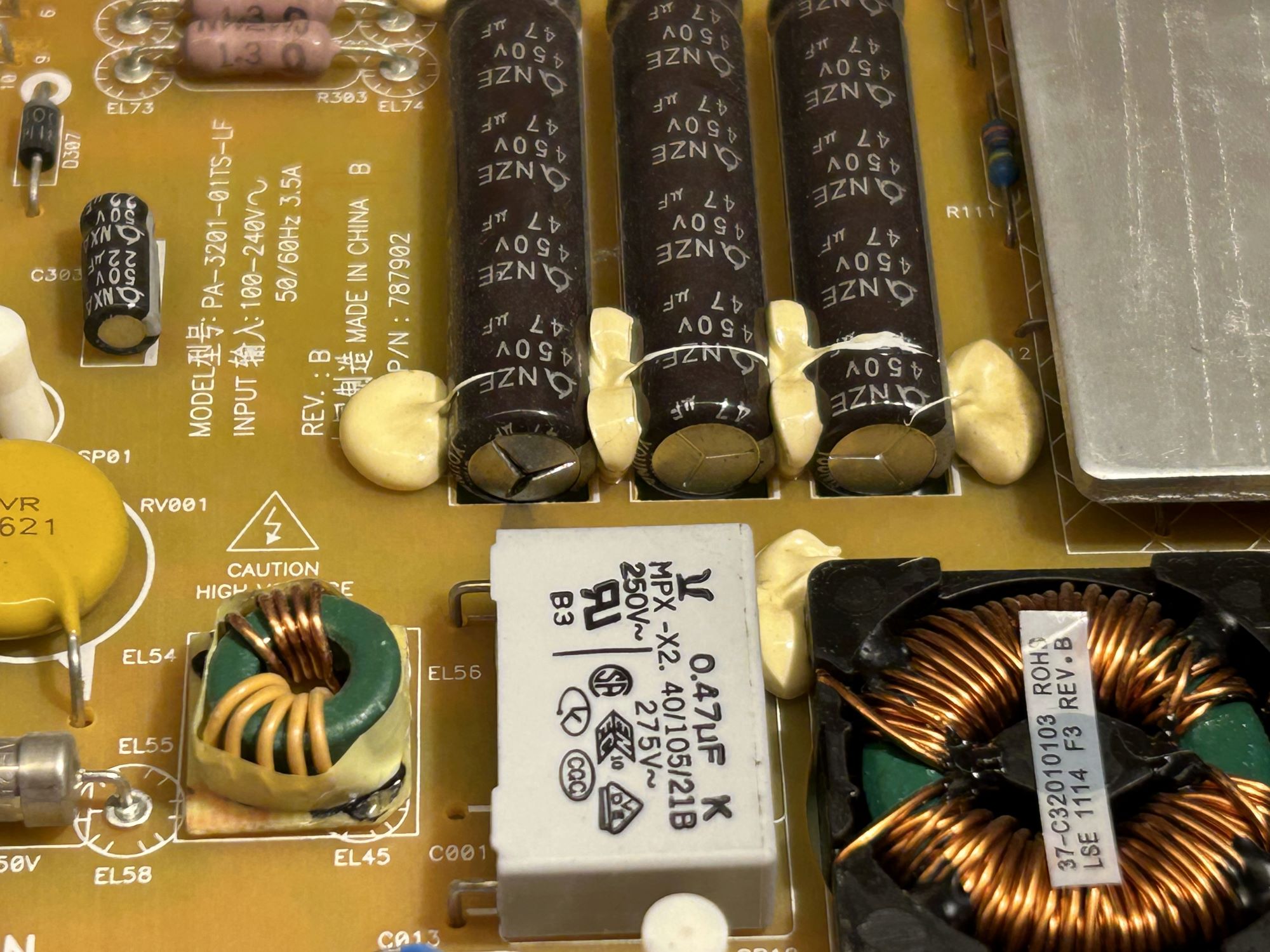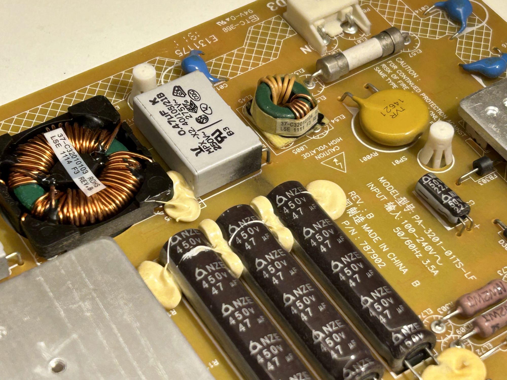 Liebe Elektroniker, ich bitte euch um Unterstützung bei dem Versuch der Reparatur meines 42" LCD-TV. Der Fernseher ist ca. 13 Jahre alt, hing Zeit seines Lebens am Strom, funktionierte einwandfrei und stand nun umzugsbedingt ca. 3 Monate stromlos im Wohnzimmer. Beim ersten Anstecken gab es einen Knall und der LS löste aus. Gestern habe ich die Netzteilplatine ausgebaut und untersucht. Auf den ersten Blick ist einer der drei Zwischenkreiskondensatoren (C113) erkennbar zerstört. Das Cap ist an den Sollbruchstellen aufgeplatzt und Schmauchspuren sind ersichtlich. Ich habe alle drei Kondensatoren ausgelötet und am Komponententester geprüft: der defekte Kondensator hat keinen Durchgang, die beiden anderen werden mit 45 µF, 1,3 Ohm ESR und 1,4 % Vloss angezeigt. Wie würdet ihr nun bei der weiteren Fehlersuche und Reparatur vorgehen? Reicht ein Tausch der Elkos aus, oder sind hier höchstwahrscheinlich noch weitere Bauteile in Mitleidenschaft gezogen worden? Folgendes habe ich noch untersucht: Den Brückengleichrichter BD001 (ganz rechts unter dem Kühlblech) habe ich entlötet und gemessen, der zeigte keine Auffälligkeiten. Der Schalttransistor Q101 (unter dem mittleren Kühlblech im unteren Drittel) für die Zwischenkreistransformatoren T100/T101 ist hochohmig (MOhm-Bereich). IC301, der Schalter für Transformatoren des Ausgangskreises, ist über den Pins 1 und 10 hochohmig (ca. 1 MOhm). Die bedrahtete Feinsicherung F001 (links unten auf der Platine, direkt am Netzeingang) hat keinen Durchgang. Die bedrahtete Feinsicherung F301 ist intakt. Über dem Varistor RV001 messe ich ca. 1 MOhm. Für den Fernseher ist der Schaltplan vorhanden, nur leider enthält dieser das Netzteil nicht. Dieses ist ein Produkt von Liteon und nennt sich PA-3201-01TS. Viele Grüße, Markus.