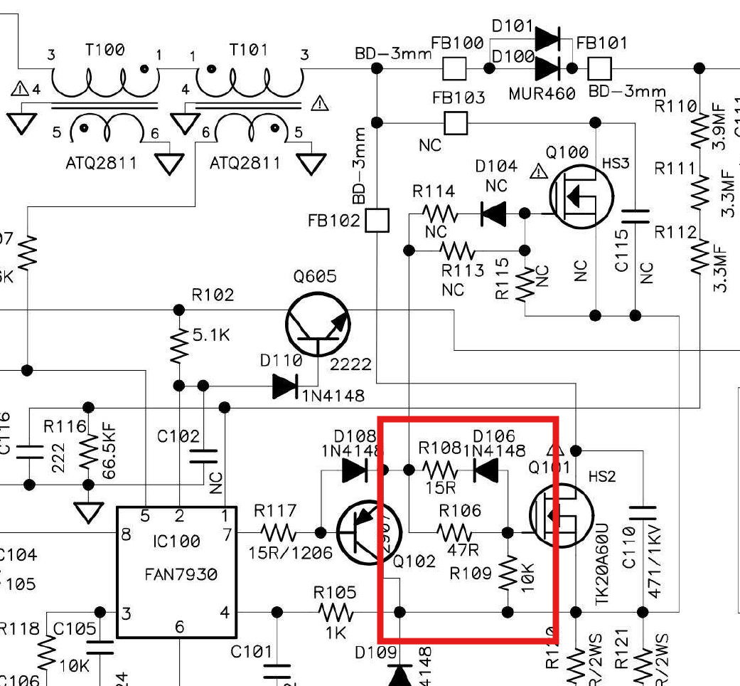 Q102 und D108 gehören auch noch dazu um das Gate schnell zu entladen. Diese Ansteuerschaltung stammt von Anfang der Achtziger und ist oft bei Siemens veröffentlicht.Grundschaltung siehe Siemens Components 18 (1980) Heft 5, Seite 220 Bild 5. Mist, zu lange gesucht. Arno