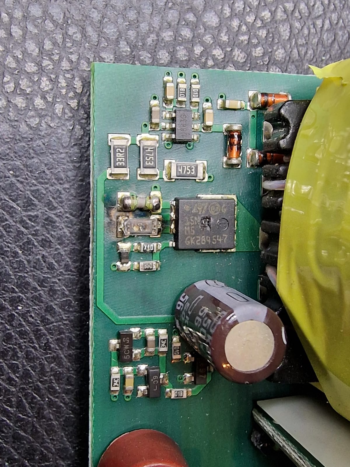 So wie es ausschaut ist aber der nicht betroffen vom Defekt. Ich frage mich grade was der 4R7 parallel mit dem oder der MELF Bauteil/Diode im Source Zweig macht. In den ganzen Referenz Schaltungen ist Source direkt auf Masse gelegt.