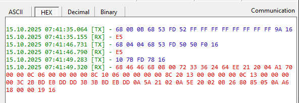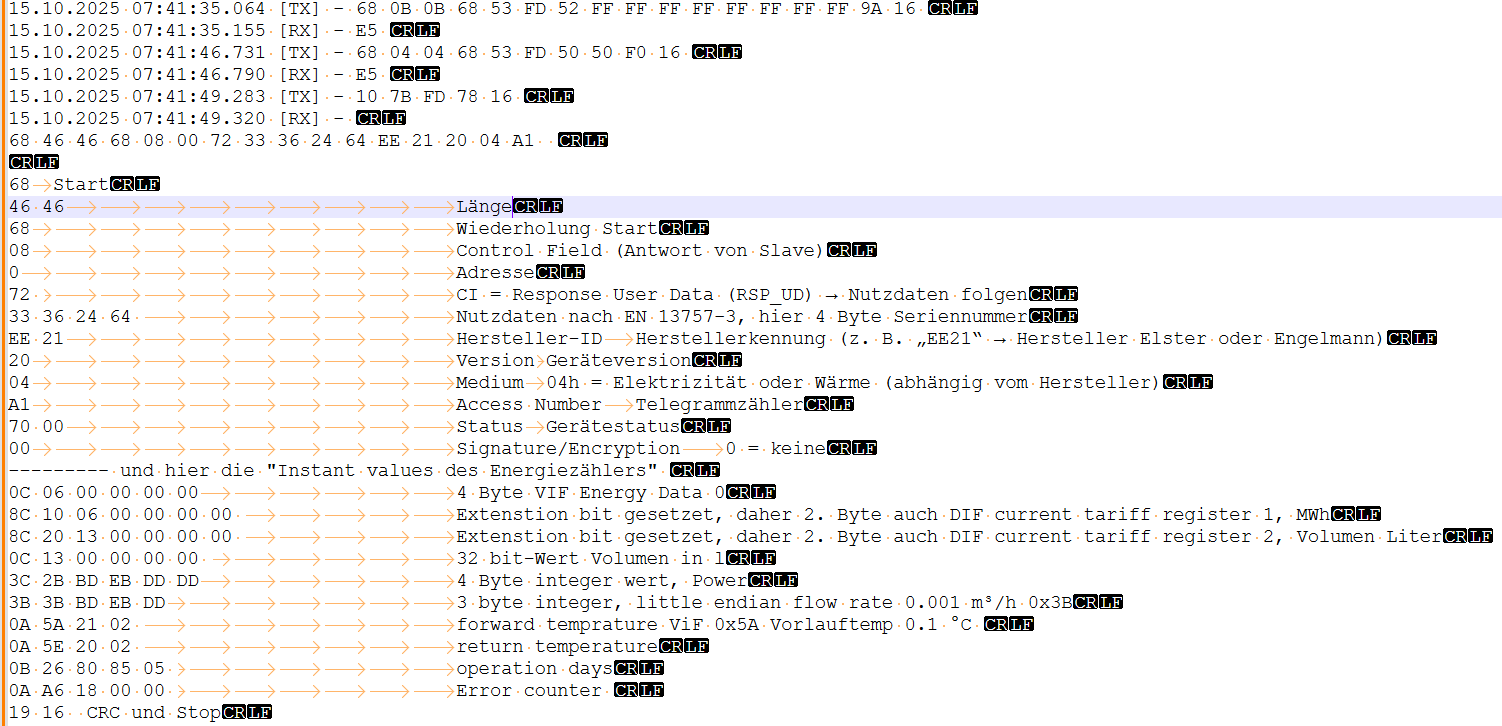 Guten Morgen Nur zur Info: Inzwischen habe ich es geschafft. Das Problem lag u.a. an einer falschen Checksummenberechnung. Leider ist auch die Dokumentation nicht optimal. Bzgl. Zählerauswahl im Bus: Ich habe einen Zälher am Bus und sendete diese Sequenz: Select device: 15.10.2025 09:10:39.389 [TX] - 68 0B 0B 68 53 FD 52 FF FF FF FF FF FF FF FF 9A 16 15.10.2025 09:10:39.480 [RX] - E5 Application reset: 15.10.2025 09:13:15.190 [TX] - 68 04 04 68 53 FD 50 00 A0 16 15.10.2025 09:13:15.249 [RX] - E5 Wenn man über das integrierte M-Bus-Modul kommuniziert, dann benötigt man wohl keine weitere Startsequenz. Anbei, zur Info, wie man z.B. schließlich die aktuellen Messdaten des Energiezählers interpretieren kann. Vielleicht nutz es jemandem von euch mal.