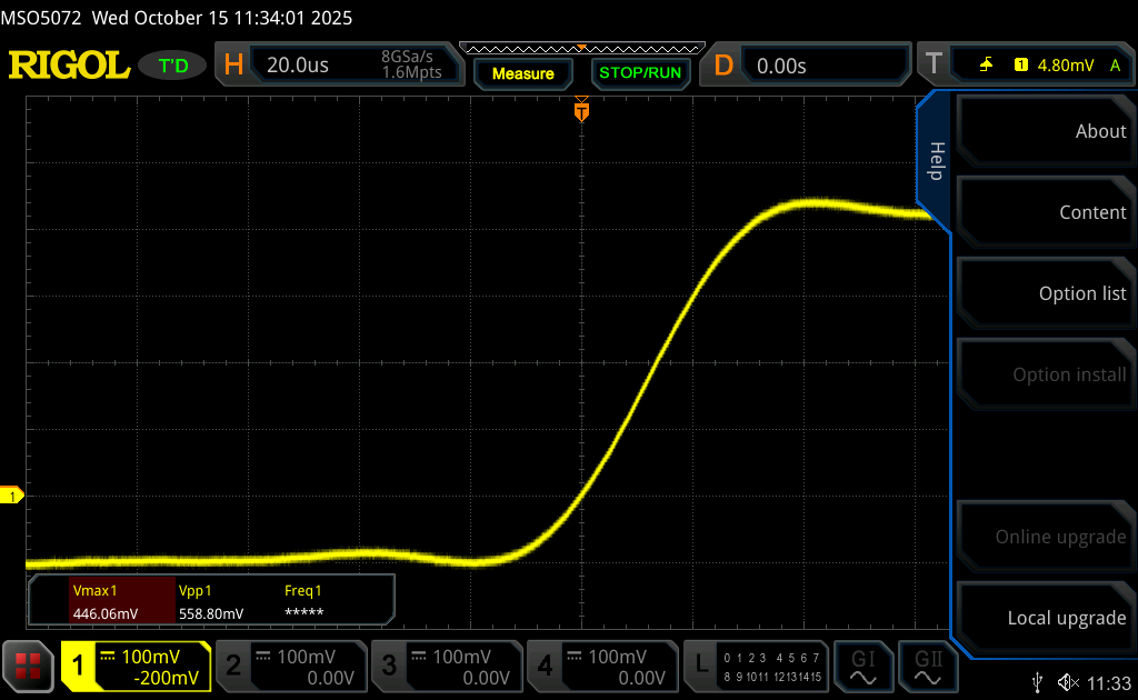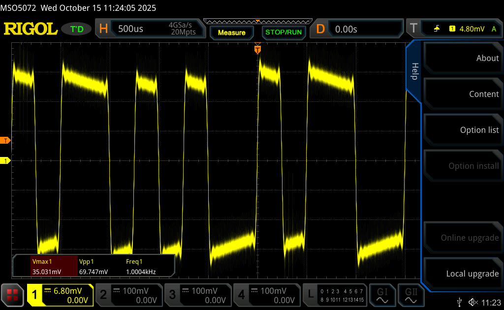 Hallo, anbei die hoffentlich gut genugen Bilder. Wobei mir auffällt, dass das Ergebnis im Vergleich zum Eingang gar nicht mal so schlecht ist? Da hatte ich gestern ein Messproblem, da war das noch deutlich abgeschliffener. Ich würde dann mal C3 noch entfernen, ob das was bringt. "Nimm einen OPV mit einer GBWP von wenigstens 10MHz" Welchen Ty könnte man da nehmen, kann ich ja auch mal probieren und vergleichen