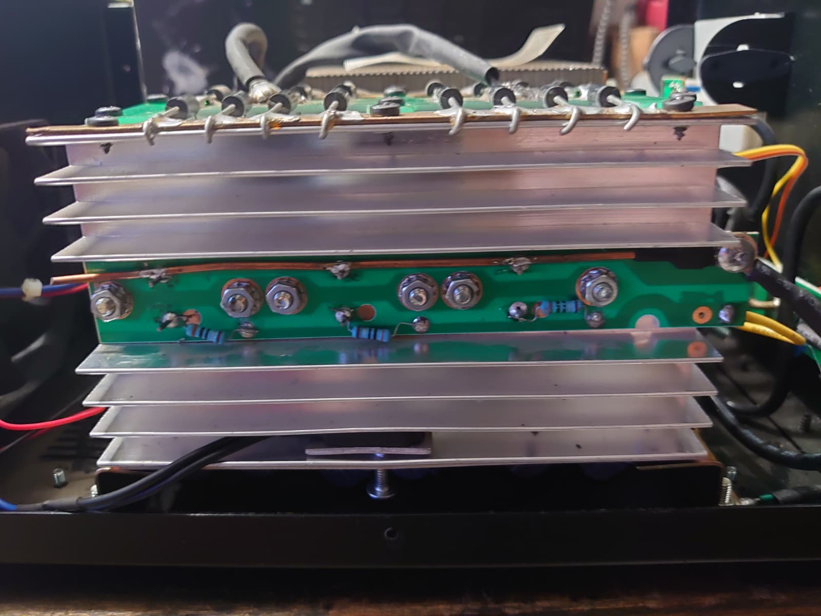 Wenn der Widerstand (Wiederstand ist zwecklos) R6 auch in der realen Schaltung der 220 Ohm direkt am Ausgang ist, spricht das für eine nicht funktionsfähige Endstufe bzw. die letzte Treiberstufe vor den vier Ausgangstransistoren. Im Normalfall bekommt dieser Widerstand maximal etwas über 1,2V ab (zweimal die Basisspannung der aufgesteuerten Transistoren). Ohne die Stromverstärkung der Endstufe (sogar noch in Darlington-Schaltung) probiert die Vorstufe über R6 alleine, den Ausgangsstrom bereitzustellen... und das wird natürlich nichts. Prüfe alle 2N3055 und deren korrekte Verschaltung, sowie ob deren Betriebsspannung an den großen Siebkondensatoren vorhanden ist.