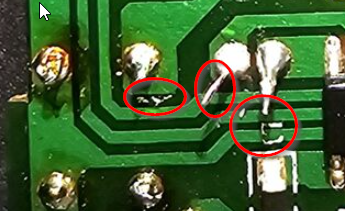 Klaus B. schrieb: > Die Lötstellen an der Fernbedienung habe ich nochmal nachgelötet. Hast du dir deine Platine einmal bei vernünftigem Licht und evtl. einer Lupe angesehen? Die rot umrandeten Teile haben da nichts zu suchen, auch wenn sie aktuell wegen Lötstopplack wohl nicht zu Fehlern führen. Klaus B. schrieb: > Wo könnte ich diese bestellen? Vorher könntest du prüfen, ob die ihr Ansteuersignal bekommen. Das Oszi ist da schon einmal eine gute Idee. Ein Blick ins Datenblatt der ICs verrät dir, was du wo messen können müsstest. > Ein Oszilloskop wäre vorhanden, kenne mich aber damit leider sehr wenig > aus. Da hilft nur ÜBEN
