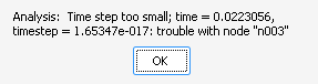 Hallo, wenn ich dem Simulationsbefehl ein startup anfüge, erhalte ich die Meldung "time step too small at 22 ms. Trouble with node n003"