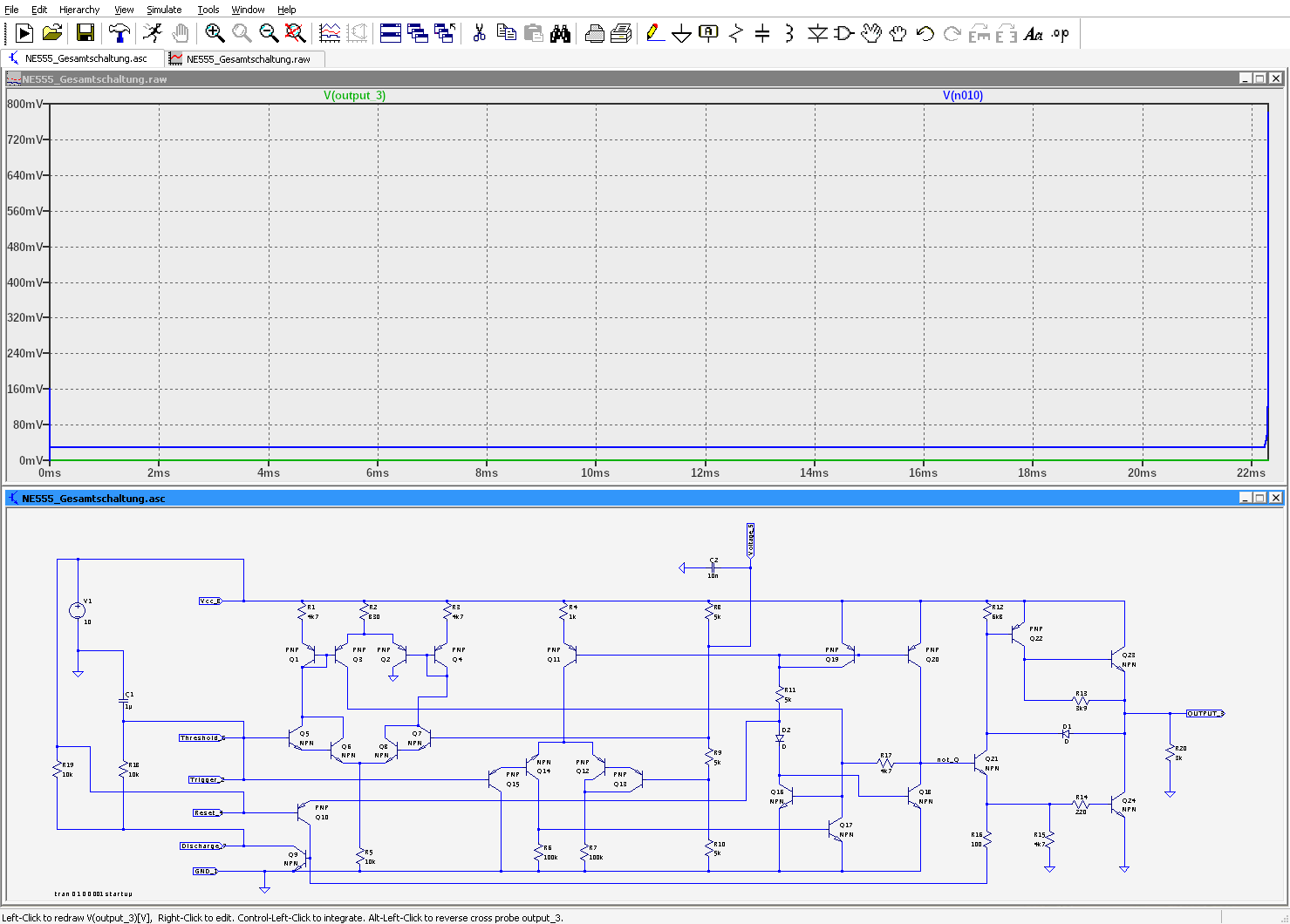 Alexander S. schrieb: > Jörg R. schrieb: >> Zum 555 gibt es wirklich gute Videos auf Youtube um den Chip zu verstehen. > > Vom Erfinder Hans Camenzind wird der NE555 in seinem Buch "Designing > Analog Chips" > http://www.designinganalogchips.com/_count/designinganalogchips.pdf in > Kapitel 11 Timers and Oscillators beschrieben. > > http://www.designinganalogchips.com/ Ich habe jetzt mal die Schaltung aus dem Buch 1:1 nachgebildet und dann wieder eine astabile Kippstufe verschalten (siehe hochgeladen Schaltungsdtaei). Trotzdem habe ich das selbe Problem. Muss ich in LT Spice eventuell die Transistoren ändern (also reale Transistoren wählen)? Oder eine Simulationseinstellung ändern? Natürlich kann ich die fertige Schaltung aus den Beispielen nehmen wie andere User schreiben, aber dann kann ich es ja nie selber zusammenbauen.