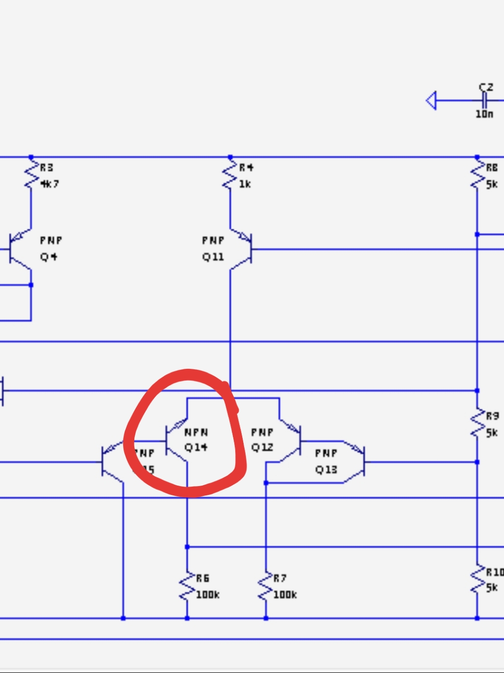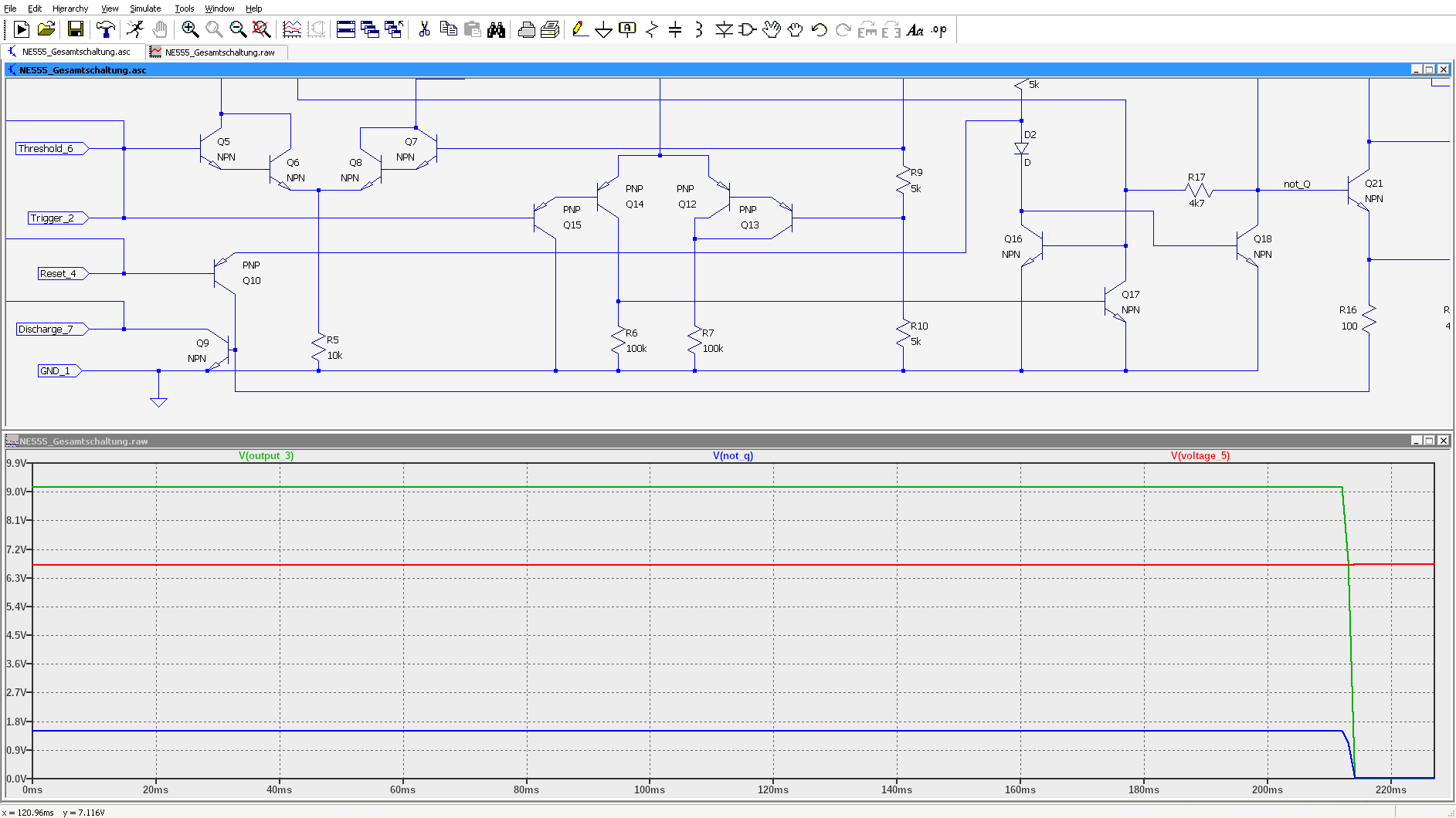 Hallo zusammen, ich baue in LTspice einen NE555 nach, aber NICHT mit dem fertigen 555-Baustein — ich möchte die Schaltung komplett mit diskreten Transistoren (NPN/PNP) aufbauen, um das Innenleben besser zu verstehen. Leider funktioniert die Schaltung nicht wie erwartet: der Ausgang bleibt dauerhaft auf ca. 9 V (Versorgung ist 10 V). Ich hoffe auf Hinweise, woran das liegen kann. Was ich gemacht habe: Versorgung: Vcc = 10 V, GND = 0 V. Ich habe die typischen Innenblöcke nachgebaut: zwei Komparatoren, ein RS-Latch (Bistabile Kippstufe) und den Entladetransistor. Alle Komparatoren und das Latch habe ich mit diskreten BJT (NPN / PNP) umgesetzt. Die Threshold/Trigger-Spannungen werden über das interne Spannungsteiler-Netzwerk (3 × 5 kΩ) nachgebildet. Meinen NE555 nach typischer schaltung für Astabile Kippstufe aufgebaut. Als Referenz habe ich folgende Schaltung nachgebaut: https://www.hackatronic.com/working-of-555-timer/ Das Problem: Ich habe dauerhafte überall definierte Gleichspannungen und nicht das typische Taktsignal. Ich wäre für jede Hilfe dankbar. Ich habe auch die LT-Spice Datei mit hochgeladen.