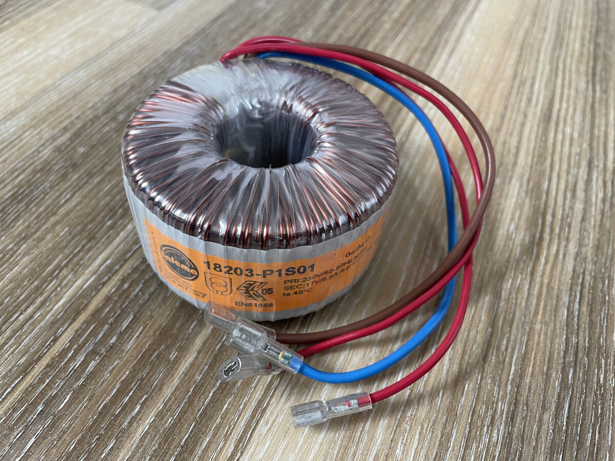 Zu diesem Trafo: 230 Volt primär ergibt 18.3 Volt sekundär ohne Belastung. Die Sekundärwindungen kann man fast alle erkennen, es sind ca. 100 Windungen. Wenn man 20 Windungen neu drauf wickelt bekommt man dort 3.5 Volt ohne Belastung.