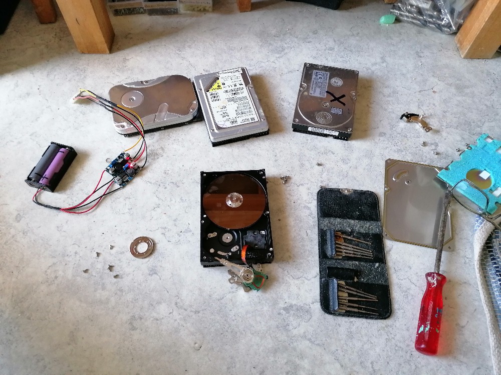 Danke für eure Antworten. Heute sind zwei der insgsamt 6 bestellten IDE Festplatten angekommen. Natürlich musste ich sie gleich zerlegen und testen. Die Samsung-Festplatten verfügen über 2 Scheiben/Platter. Also habe ich alle 4 Scheiben ohne Spacer in einer der beiden Festplatten montiert. Dies ging problemlos. Dann schloss ich alles an den Molexstecker an. Zuerst lief der Motor hoch. Nach ca. 10 sek aber hörte dieser aber wieder auf und die Scheiben rotierten bis zum Stillstand... Das hatte ich mir natürlich nicht gewünscht. Jetzt kann ich nur hoffen, dass eine der anderen Festplatten dauerhaft an bleibt. Zur Sicherheit habe ich mir aber einen 12V/30A brushless-Treiber inkl. Servotester bestellt. Wenn sich die Festplatten alle nicht ständig antreiben lassen, schließe ich den Festplattenmotor einfach an den brushless-Treiber an. Dann benötige ich die gesamte Elektronik der Festplatte nicht mehr. Wenn es Neuigkeiten gibt, kann ich gerne davon berichten.
