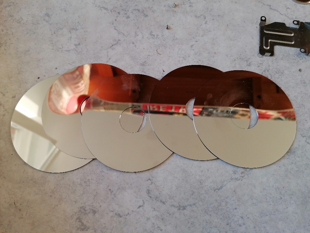 Jens M. schrieb: > die sind ja aus Alu. Dieser Meinung war ich auch. Bis ich eine Scheibe biegen wollte. Bei genügend Druck zersplitterte diese. Wäre beinahe ins Auge gegangen. Seither weiss ich, dass diese aus einem harten Glas sind. Christoph E. schrieb: > Ich würde dann den Abstandhalter zwischen den beiden Scheiben ausbauen > und dann soviele Scheiben wie möglich einbauen für einen größeren > Drehimpuls. Scheiben möglichst vom gleichen Hersteller. Denn nicht alle haben den gleichen Lochdurchmesser.