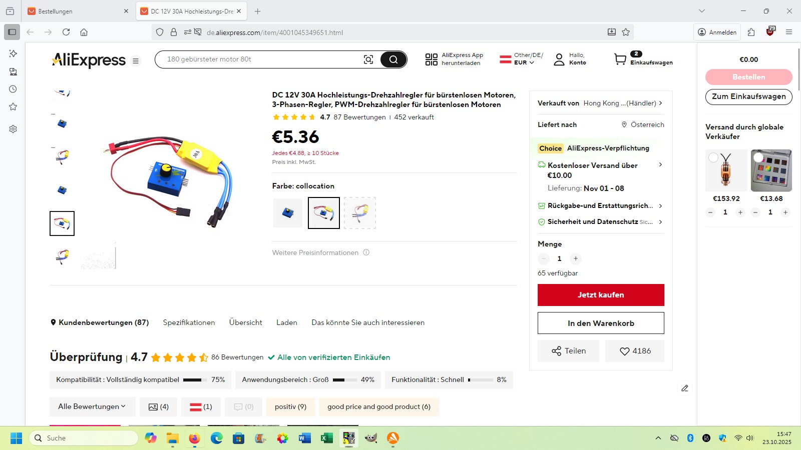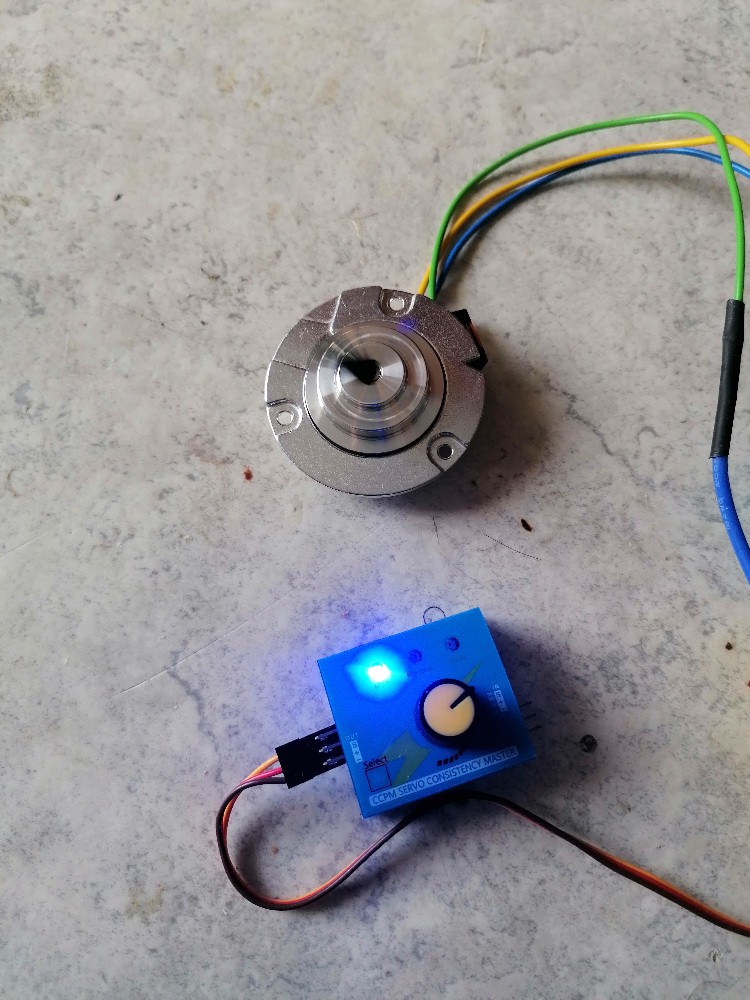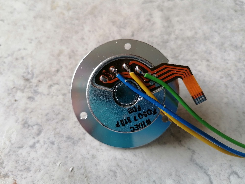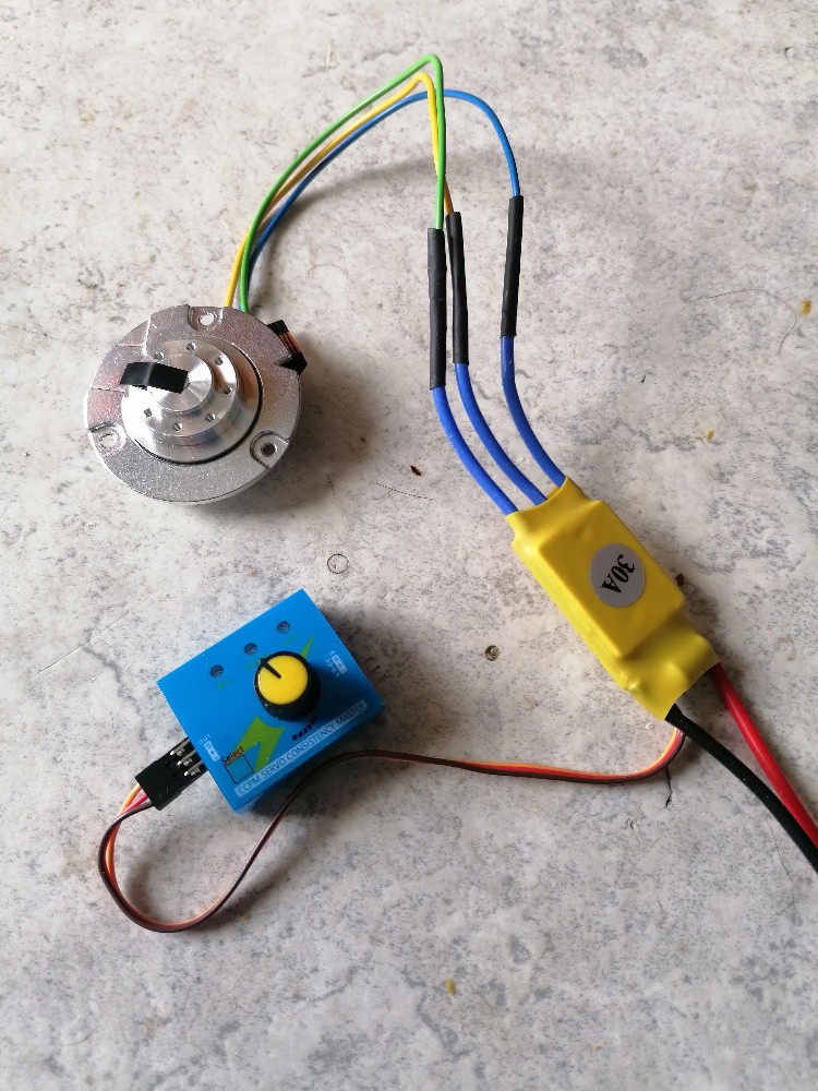 Der Vollständigkeit halber füge ich dies hier noch an. Habe mir ja einen Brushless-Motortreiber auf aliexpress gekauft. Dieser hat bekanntlich 3 Ausgänge, der brushless-Festplattenmotor aber 4. Man misst mit einem Ohmmeter einfach die Widerstände zwischen jeweils zwei benachbarten Anschlüssen. Ergibt sich zwischen zweien ein niedrigerer Wert, so muss der linke/rechte davon nicht angeschlossen werden. Der Motor dreht sich sehr schön und lässt sich über den Servotester in der Drehzahl regeln...