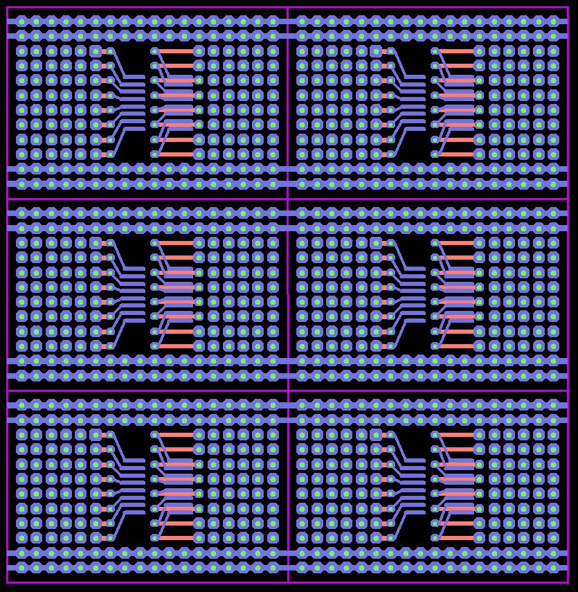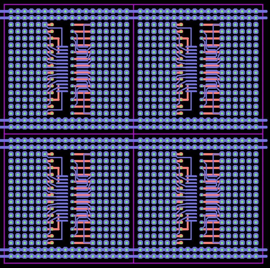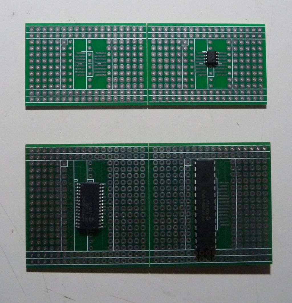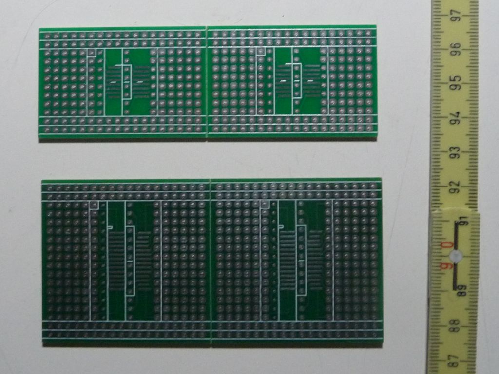 Stephan S. schrieb: > Selber entwerfen und produzieren lassen ist wohl keine Option? Kann man gut selbst machen, 2 Beispiele s. Bilder: die korrespondierenden SOIC- und DIL-Anschlüsse sind entsprechend verbunden mit der äussersten Reihe innerhalb der weissen Markierung. Oben und unten je 2 durchgehende Reihen für VDD und GND. Je 6 bzw. 4 Platinen passen gerade in 10x10 cm
