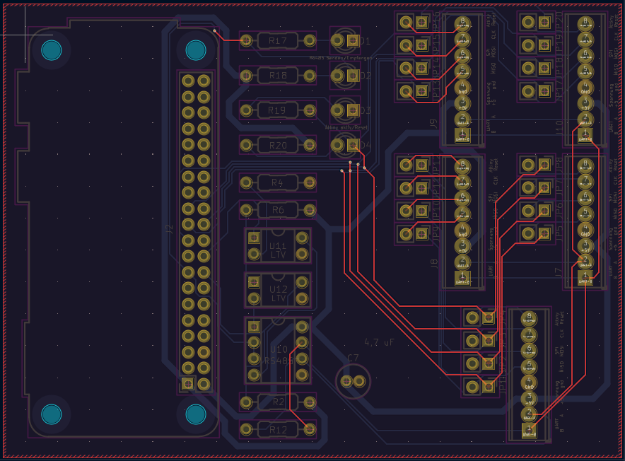Wie machst du die Sendeumschaltung? So wie ich das sehe ist der RS485 TX Treiber am PI immer eingeschaltet. Dir ist schon bekannt dass immer nur einer die Füße auf der Leitung haben darf? Das läuft hier auf Request/Response raus. Nicht wie bei CAN, dass jeder senden kann wann er Lust hat 😁 Edit: falsch abgebogen. GPIO22 macht die Umschaltung. Also es gibt hier Leute die kotzen immer über zu viel Labels. Ich bekomme Brechreiz bei dem Schaltplan. Hier hätten ein paar Labels gut getan.