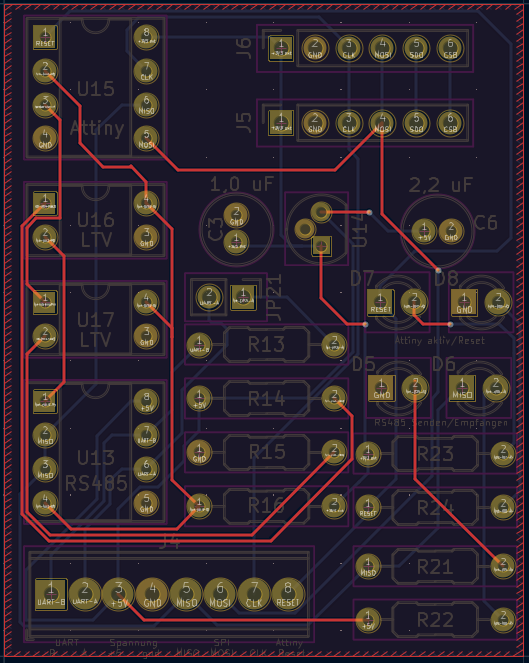 Hallo liebe Profis, (sorry wenn ich nicht immer gleich reagiere, da ich das nur als Hobby betriebe, sitze ich nicht die ganze Zeit am Rechner) ich möchte mich aber gerne an euch wenden, da ich nun mehr schon 4 Wochen bastle... :-( im Zuge eines Projektes soll ein unterirdisches Bauwerk über mehrere Monate überwacht werden. Es sollen an 8 Messstellen jeweils Luftdruck, Temperatur und Feuchte (BME280) gemessen werden. Da die Parallelschaltung über SCI und ca. 25 m Leitungslänge nicht funktioniert hat, habe ich mich für obige Variante (Siehe Schaltplan) entschieden: GY-BME280 über I2C mit Attiny85 auslesen und über RS485 an den Pi senden. Das Auslesen des BME280 mit dem Attiny85-Board funktioniert schon. Nun arbeite ich gerade an der RS485 Verbindung zum Pi und habe das Problem, dass der SN75176BP auf dem Attiny85-Board beim Senden extrem heiß wird. Solange alle SN75176 (aktuell nur 1 x Pi-Board und 1 x Attiny85-Board) im Empfangsmodus sind, bleiben sie kalt. Ich habe die Schaltung und die Platinen beigefügt. Die Messungen von VCC, A, B, GND, RE und DE sind in Ordnung... Spannung an Di mit wechselnden 1,7 zu 3,3 V ist komisch wenn ich LTV U17 auf GND ziehe sollt das nahe 0V sein... Spannung an R ist durch Vorwiderstand und Diode bei ca. 4,2V über LTV U16 und soll später dann auf die Anfrage für das Auslesen vom Pi hören. R sollte demnach Hochohmig (Input) sein. Ich verstehe Momentan nur nicht warum der SN75176BP im Sendemodus glühend heiß wird... (habe schon ein Branding vom Testen T>>100°C -> SN75176 bereits getauscht wegen Verdacht auf defekt) Falls noch Angaben fehlen bitte Fragen... Ich versuche dann so schnell als möglich zu antworten... Vielen Dank für eure Hilfe