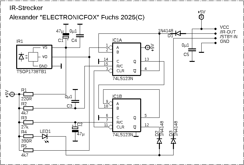 Ich hatte 3 TV-Geräte und eine HD-DVBS-Box welche folgende Symtome zeigten: - Zeitweise war das Gerät nicht steuerbar. - Schaltete sich gern ohne Zutun ein oder aus. - Änderte gern die Einstellungen während des Betriebs. Nachdem schon Elkos im Netzteil, Softwareupdates und sogar der IR-Empfänger ausgetauscht wurden in den Service-Werkstätten, landeten die Geräte schließlich nach der Garantiezeit im Reparaturcafe. Messungen ergabe seltsame Fehler im IR-Übertragungsprotokol. Manchmal waren bei NEC die Signale zu kurz, Bei SONY sogar zeitweise etwas lang. Die Geräte reagierten sogar auf manche LED-Spots in der Nähe des IR-Empfängers. So habe ich mit den 74LS123 experimentiert und siehe da, die Geräte laufen nun Fehlerfrei. Der IR-Strecker tut gute Dienste. mit dem zweiten Multivibrator konnte sogar eine Quittierungsanzeige realisiert, dafür kann die STBY-LED herhalten. Betriebsspannung +5V, Signalleitungen 3,3 bis 5V möglich. Habs auch mit RC5 und MOT-Code getestet. Obwohl es bei Technisat selten Probleme gibt, habe ich auch eines deren Geräte damit getestet, was auch sehr gut funktionierte.