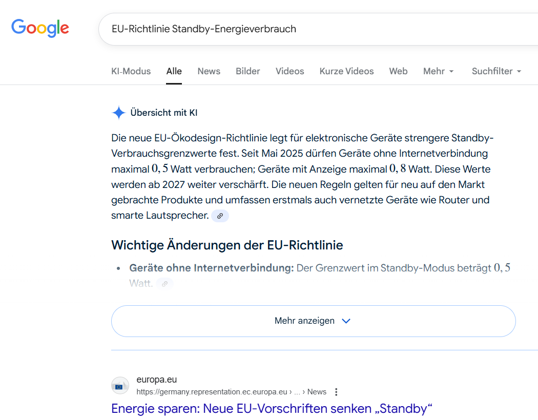 Georg M. schrieb: > EU_Standby.png Google-KI-Dreck, gibt es das auch aus seriöser Quelle? G_Maps stellt langjährig bekannte Adressen falsch dar, G_ fantasiert irgendwelchen Mist per KI - das wird täglich schlimmer und übertrumpft Wikipedia, der ich auch nur sehr begrenzt traue. Ich bestreite nicht, dass die 10 Watt für Geräte "Baujahr 2020 bis 2022" dummes Zeug sind. Ich bestreite auch die Forderungen der Ökodesign-Richtlinie nicht, die seit min. 2009 gelten. Interessant, dass nun auch eine 'Prüfstandserkennung' gilt, heise von 2023: https://heise.de/-8971101 Abdul K. schrieb: > Mein türkischer Telefunken-TV Ich habe mir vor Jahren mal im lokalen Markt einen Telefunken angesehen und seitdem nie wieder, der hatte das mit Abstand schlechteste LCD-Panel aller.