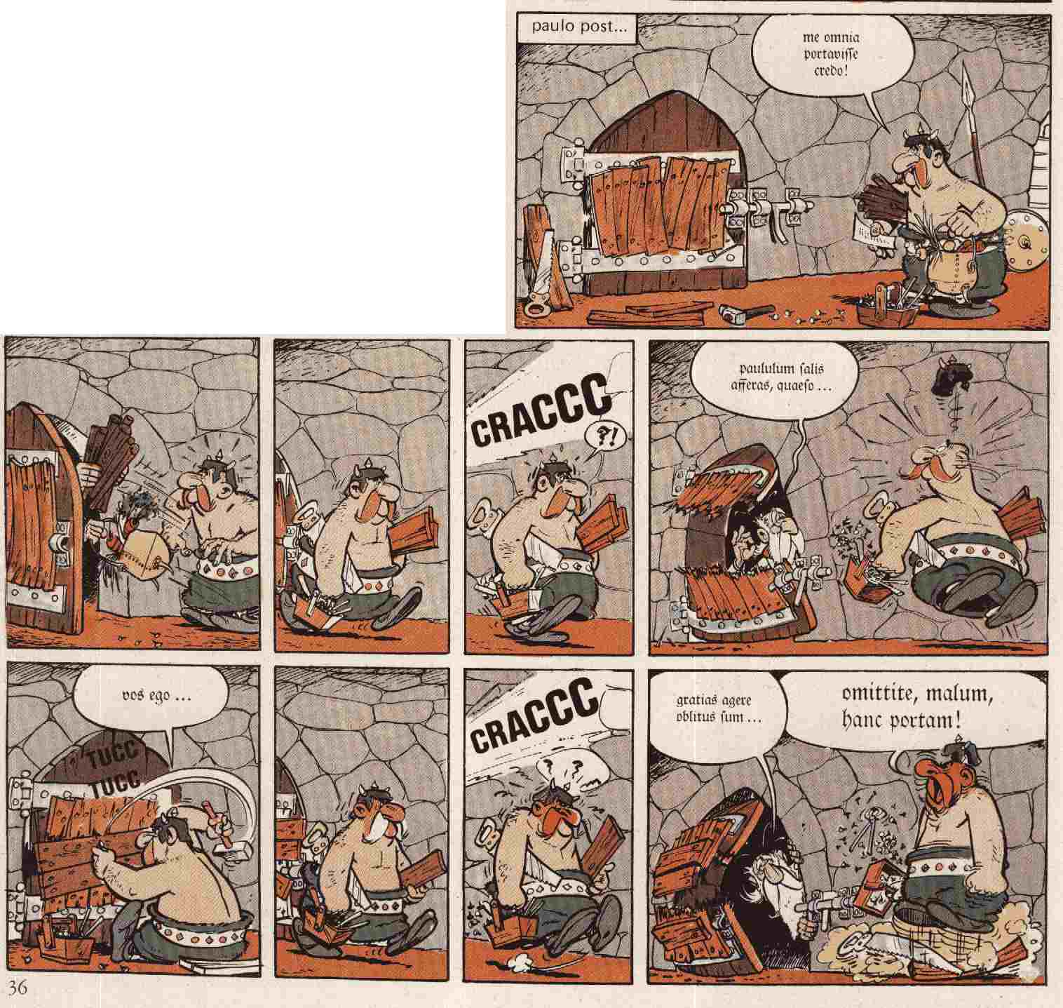 Mein Asterix-Zitat muss wohl in "Asterix bei den Goten" gewesen sein. Ich habe nur die lateinische Version vorliegen. Das Türgeräusch heißt hier CRACCC. Miraculix verlangt hier noch etwas Salz und bedankt sich anschließend.