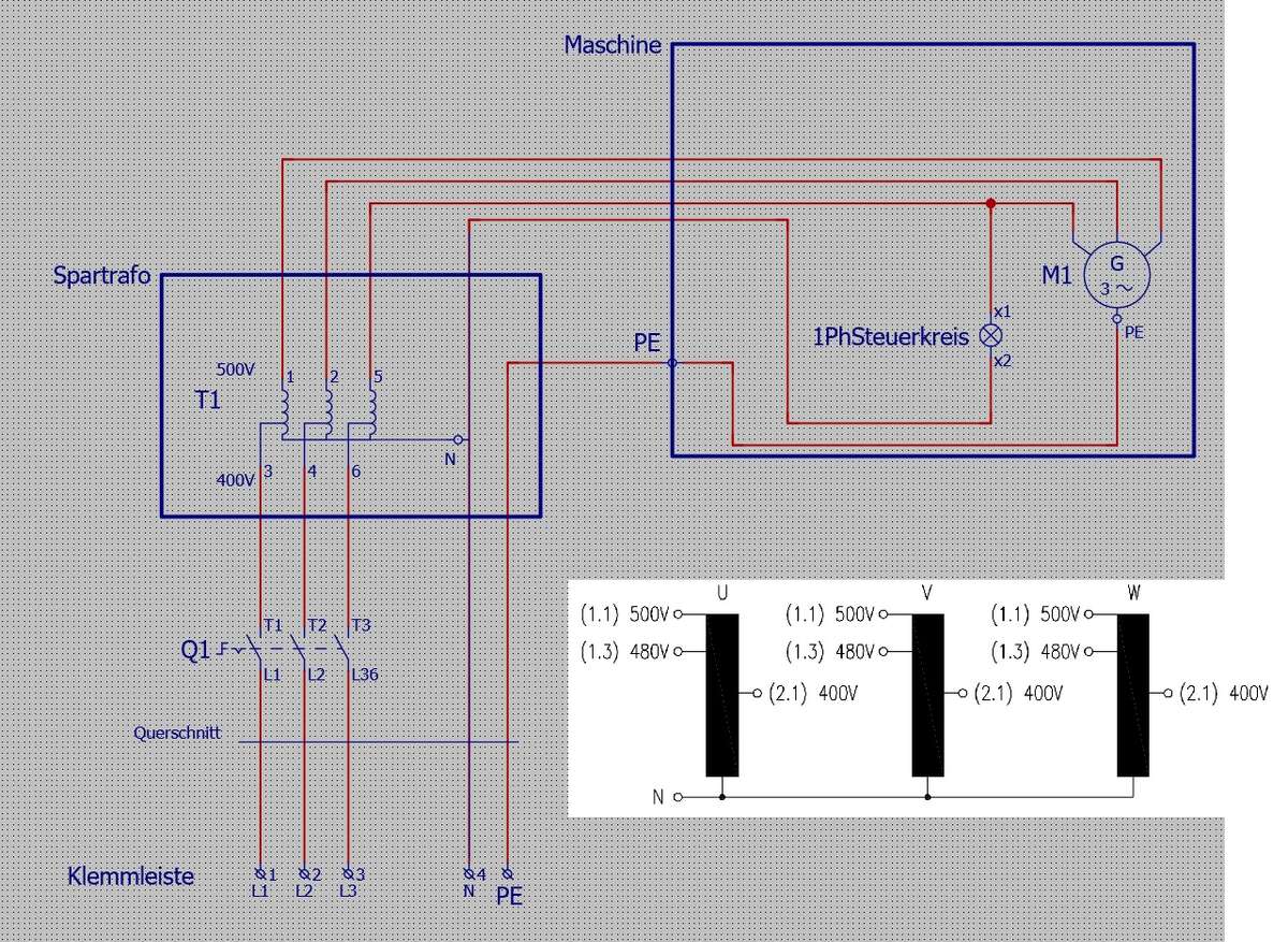 Hallo zusammen, ich habe eine fachliche Frage zu Drehstrom-Transformatoren im Dreieckbetrieb als Spartransformator am deutschen Stromnetz. Wie schließe ich einen einphasigen Verbraucher korrekt an? Darf ich den Schutzleiter (PE) meiner Maschine gemeinsam mit dem Trafo am Haus-Potentialausgleich anschließen? Wie realisiere ich den Neutralleiteranschluss an meiner Drehbank, wenn die Maschine 3×500 V benötigt und zusätzlich einen Neutralleiter? Rahmenbedingungen: In der Maschine ist kein weiterer Transformator vorhanden. Die Steuerspannung (z. B. die Leuchte im Bild) wird zwischen Phase und Neutralleiter abgegriffen. Netzform: TN-C-S (klassisches deutsches Niederspannungsnetz, 230/400 V, 50 Hz). Vielen Dank für eure Unterstützung! Viele Grüße Moe