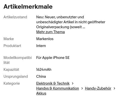Gustav K. schrieb: > Aber wo will man diese Bleche plus die passenden > Schrauben her kriegen? Und welches Display taugt was und welcher Akku > hat die richtigen Dimensionen und hält einige Jahre? Nicht einfach zu beantworten. Also bei Ali habe ich NICHT gekauft. Bleche plus passende Schrauben musst Du wohl vergessen. Ordentliche und verlässliche Teile (Display, Akku) hat ehemals die Fa. idoc.eu aus Berlin zu reellen Preisen verkauft. Aber dort finde ich nix mehr außer die immer noch brauchbaren Reparaturanleitungen. https://www.idoc.eu/guides/de/apple/iphone-se (Mehrfach) Gute Erfahrungen mit Akkus habe ich mit diesem Händler gemacht: https://www.ebay.de/itm/146337932590
