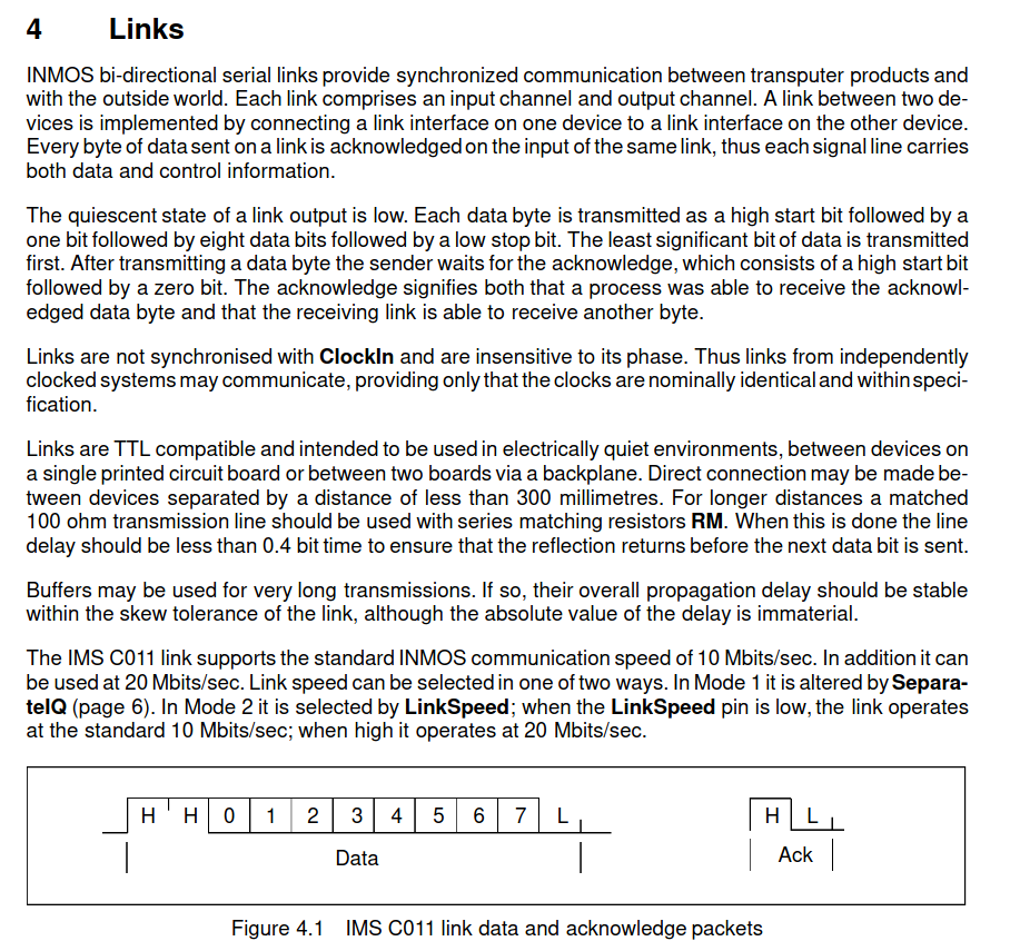 Was mich ein wenig wundert beim Transputerlink: Es gibt jeweils eine Link-Out und einen Link-IN, aber es wird z.B. für jeden Link die Richtung umgeschaltet, um das Acknowledge zurück zu senden. Wäre es nicht sinnvoller gewesen, die Richtung beizubehalten und wie bei einer seriellen Leitung das Acknowledge per RX zurück zu senden?