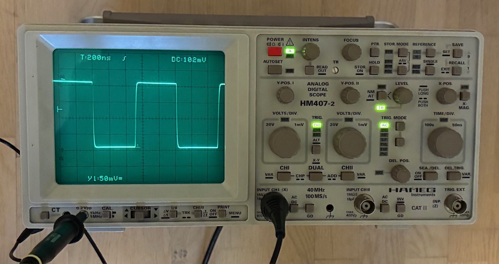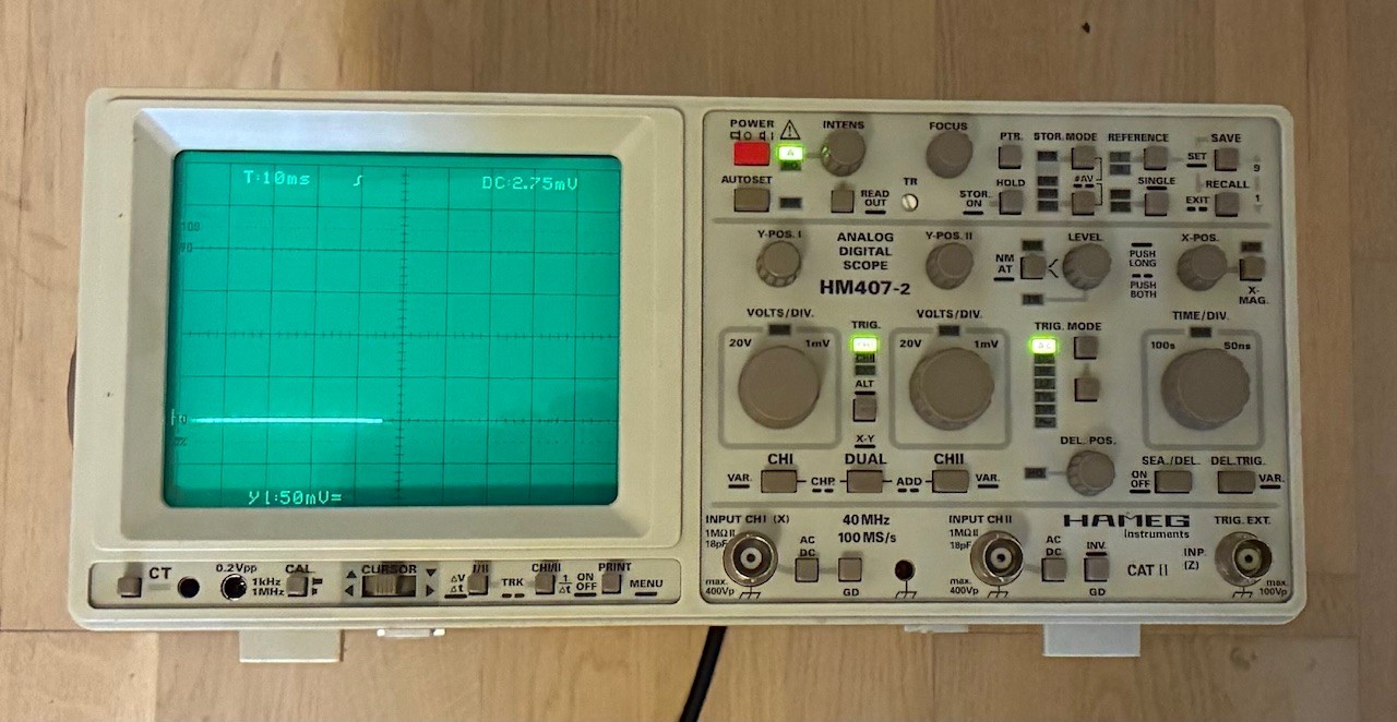 Verkaufe mein HM407-2 Oszilloskop von Hameg. Es vereint die Vorteile von analogen und digitalen Oszillokopen mit 40MHz und 100MS/s in einem Gerät. Über eine serielle Schnittstelle auf der Rückseite kann das Oszilloskop ferngesteuert und ausgelesen werden. Voll funktionsfähig, alle Knöpfe/Schalter/LEDs funktionieren. Innen wie außen sauber und in einem sehr guten Zustand. Mitgeliefert wird kein weiteres Zubehör außer einem Stromkabel. Service-Manual und Bedienungshandbuch kann per Mail zugeschickt werden. Preis: 150 Euro Gruß Haydar