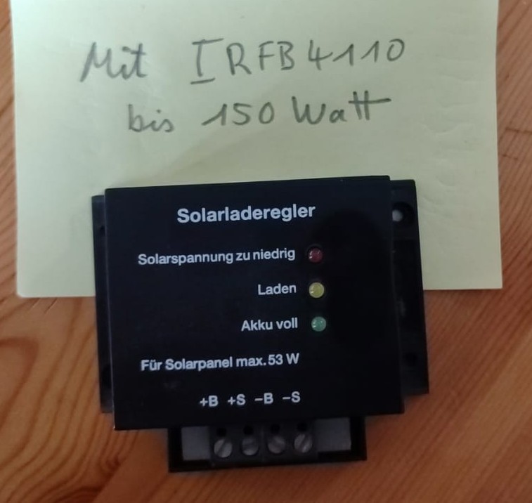 Ich verkaufe drei PV-Laderegler. 1. 5.-€ kleiner Regler, 12V (14.4V einstellbar) bis 150W mit dem alternativ eingebauten IRFB4110 2. 6.-€ mittlerer Laderegler, 12/24V, bis 30A, original verpackt, unbenutzt 3. 8.-€ großer Laderegler, 12/24V, bis 100A, max.50V Eingangsspannung Versandkosten 4,20€ (DHL) Abholung sinnvoll in Emmelshausen. Übergabe am Mitfahrerparkplatz Autobahnabfahrt möglich. Anfragen:PN
