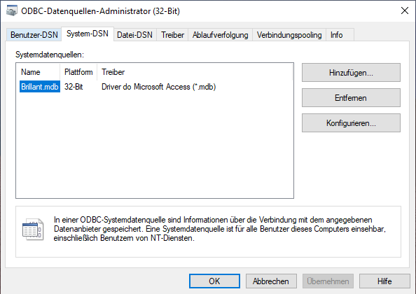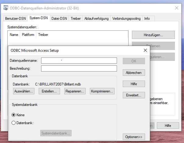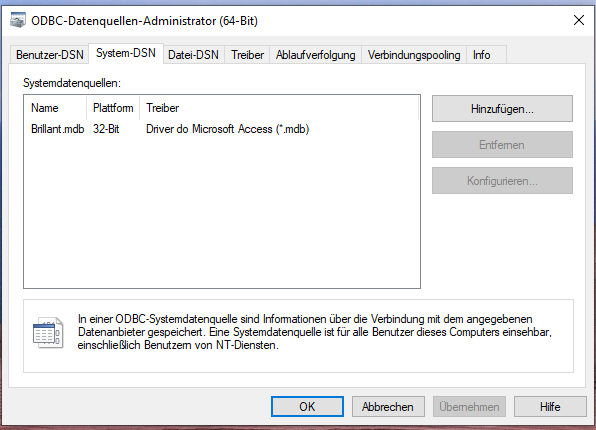 Harald K. schrieb: > Du wirst in die beiden leeren Eingabefelder auch etwas eingeben müssen, > mindestens "Datenquellenname" darf nicht leer sein. habe ich eingentlich gemacht. Dort habe ich den Dateinamen Brillant.mdb ohne Pfad eingegeben obwohl er bei "Datenbank:" schon mit dem vollen Pfad steht. Er wird dort beim grafischen Auswählen der Datei nicht automatisch übernommen was ich meine daß es beim ODBC Registrieren von XP noch gemacht wird. Ohne diesen manuellen Eintrag steht dann auch in der 32 und 64 bit Tabelle nichts drin. D.h. der Dateiname Brillant.mdb wird direkt dorthin übernommen.