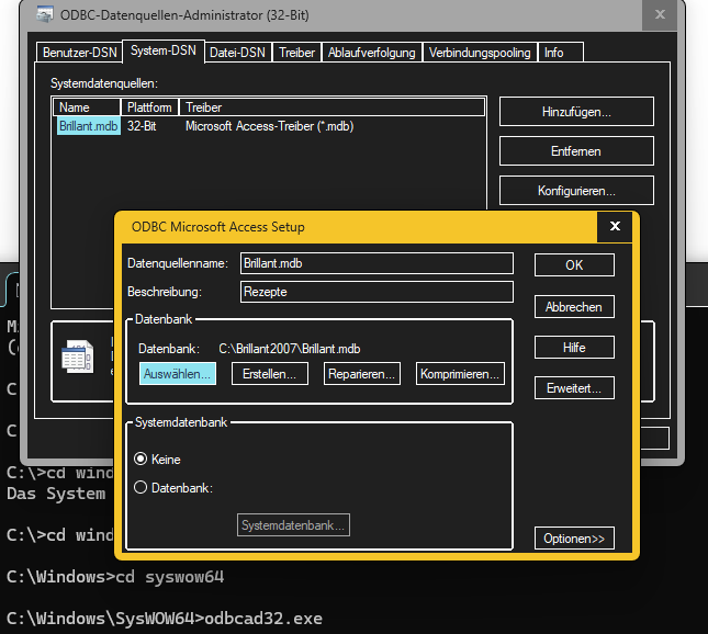 Momentan bin ich zwangsläufig einen Schritt auf W10 zurück. Alle 32 bit OCX scheinen mit regsvr32 manell korrekt eingebucht und erzeugen keine Fehlermeldungen mehr. Probleme gibt es mit der mdb Datenbank bzw. mit ODBC. Auf dem 64bit W10 ist eine 32bit Version von Office10 installiert. Ich nehme an, daß der mdb Treiber aus diesem Paket stammt? Mit Access kann ich dann das mdb file manuell öffnen. Die Inhalte erscheinen korrekt. Unter WindowsVerwaltungsprogramme finde ich sowohl ODBC Datenquellen (64-bit) wie auch ODBC DataSources (32-bit) in dtsch bzw. Englisch. Ich rufe die 32 bit Version als Administrator auf. Dort trage ich in System-DSN (weil es für alle Benutzer gelten soll) meine Datenbank.mdb ein. "Hinzufügen" wählt zuerst einen passenden Treiber aus. Es werden auch hier zwei scheinbar passende Treiber in zwei Sprachen angeboten. Die Sprache sollte hier eigentlich egal sein. Driver do Microsoft Access (*.mdb) Microsoft Access Driver (*.mdb) Danach werde ich aufgefordert, das Datenbankfile auszuwählen. Die ausgewählte Datenbank wird zunächst mit vollem Pfad angezeigt, aber die ok Taste ist weiter ausgegraut. Als Datenbankquelle kann ich den Dateinamen ohne Pfad aber manuell eingeben. Danach kann die OK Taste betätigt werden und die Datenbank erscheint in der Liste eingebuchter ODBC Quellen. Allerdings erscheint sie automatisch gleichermaßen im 64 bit Fenster. Sie hat in beiden Tools die Platform 32bit vermerkt. Die VB6 Anwendung kann auf die Datenbank aber nicht zugreifen was ich an einem Runtime Error 13 - type mismatch an dieser Stelle festellen kann. Könnte es sich um dieses Problem handeln? https://learn.microsoft.com/de-de/troubleshoot/sql/connect/odbc-tool-displays-32-bit-64-bit