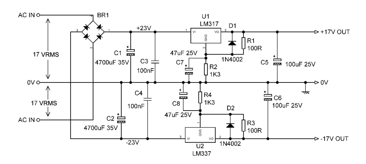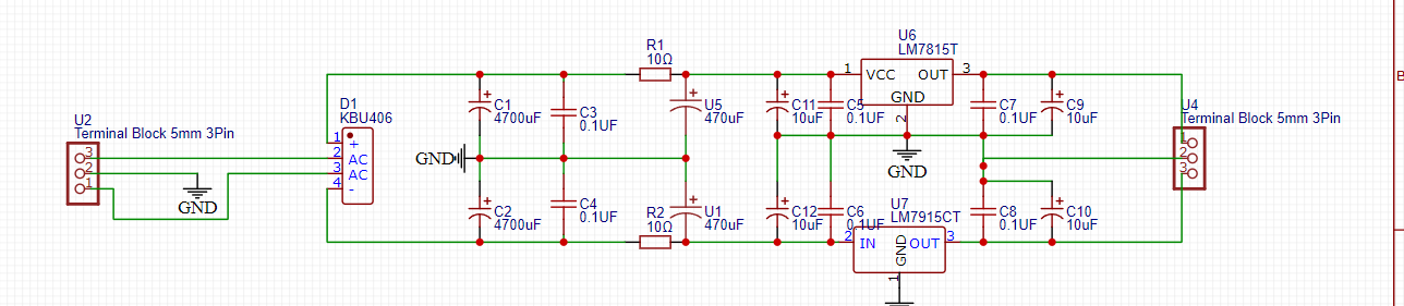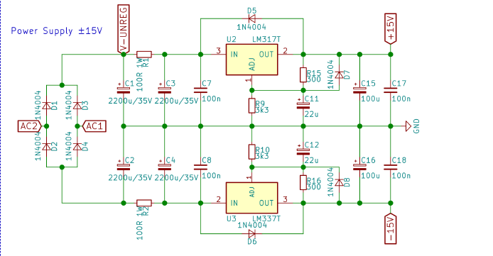 Ein einfaches +-15V Netzteil mit Sternmasse..? Wird das so gehen und was kann man verbessern? Links kommt ein 2x 18V Ringkern und das soll z.B für einen Vorverstärker dienen