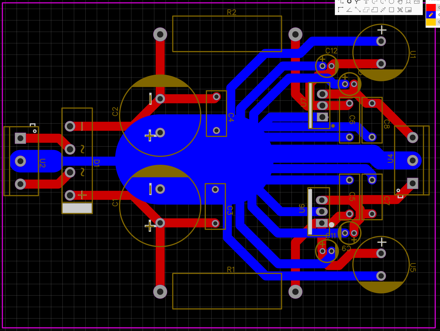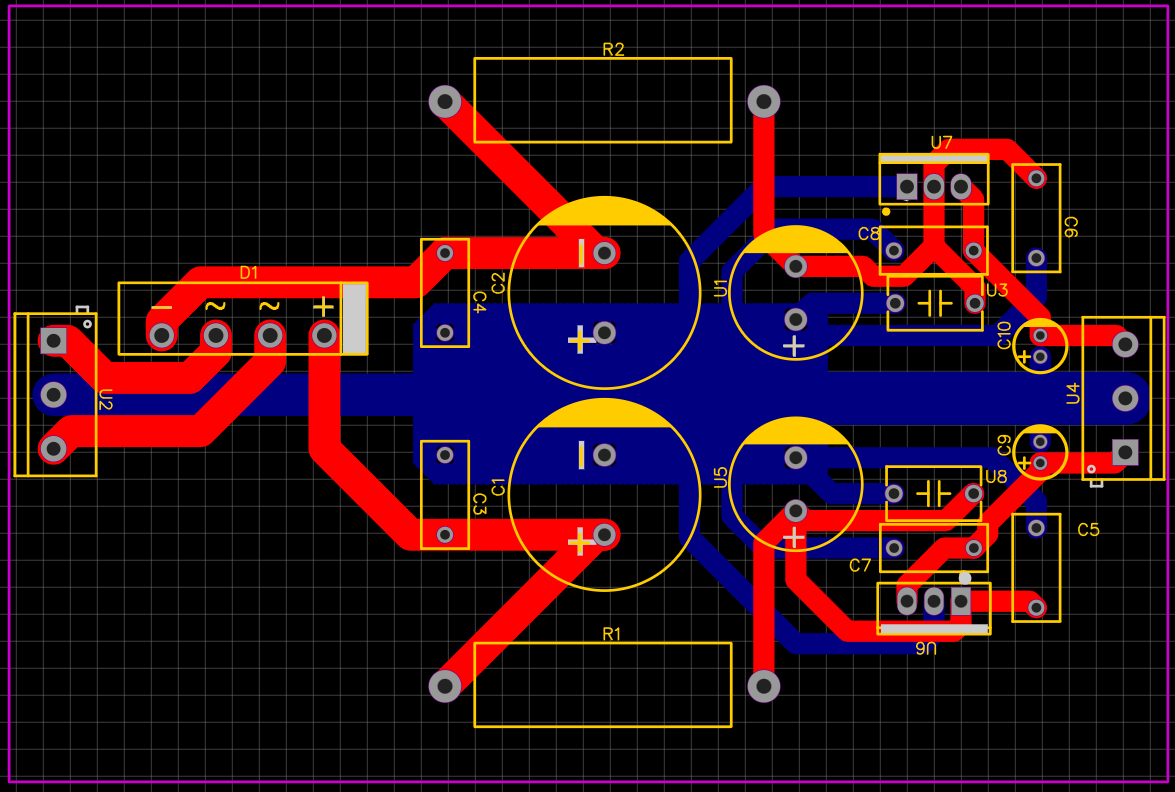 Du kannst die komplette Unterseite der Platine induktivitätsarm mit Kupfer Fluten, auf der Oberseite kannst du die Automasse mit einer Aura von ca. 1 mm einsetzen. Die Lötpads von U7 kannst du aus Stabilitätsgründen genauso in die Länge ziehen wie die Lötpads von U6. Wenn du die beiden 15 Volt Festspannungsregler liegend einzeichnest, dann könntest du die Automasse auf der Oberseite noch zur Kühlung mit heranziehen (2 Stück 2,5mm Bohrungen für selbstschneidende Blechschrauben nicht vergessen)! Die Lötpads vom Gleichrichter und von den beiden 4700 uF Elkos kannst du ebenfalls noch im Durchmesser vergrößern, denn das sind hohe Bauteile mit einer mechanischen Hebelwirkung! C11 und C12 kannst du weglassen.