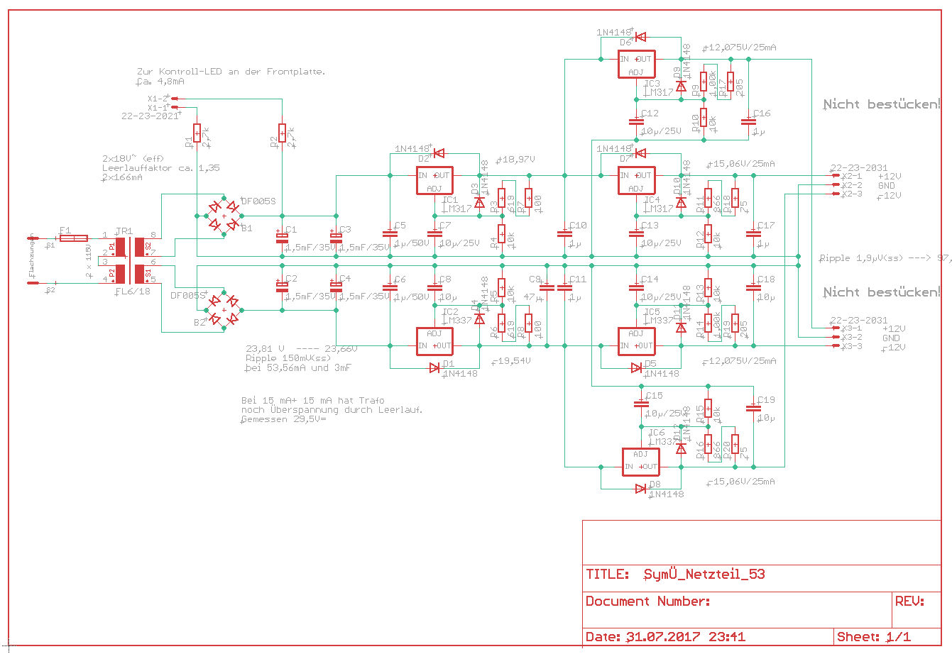 Okay, danke für eure Tipps, ich denke das MFOS Netzteil (oben erwähnt) könnte vielleicht gut sein, es hat Angstdioden und die Beschaltung der Regler ist due selbe wie im Datenblatt. Vielleicht kann man die Kapazität der Elkos noch etwas reduzieren. Habt ihr sonst noch Empfehlungen?