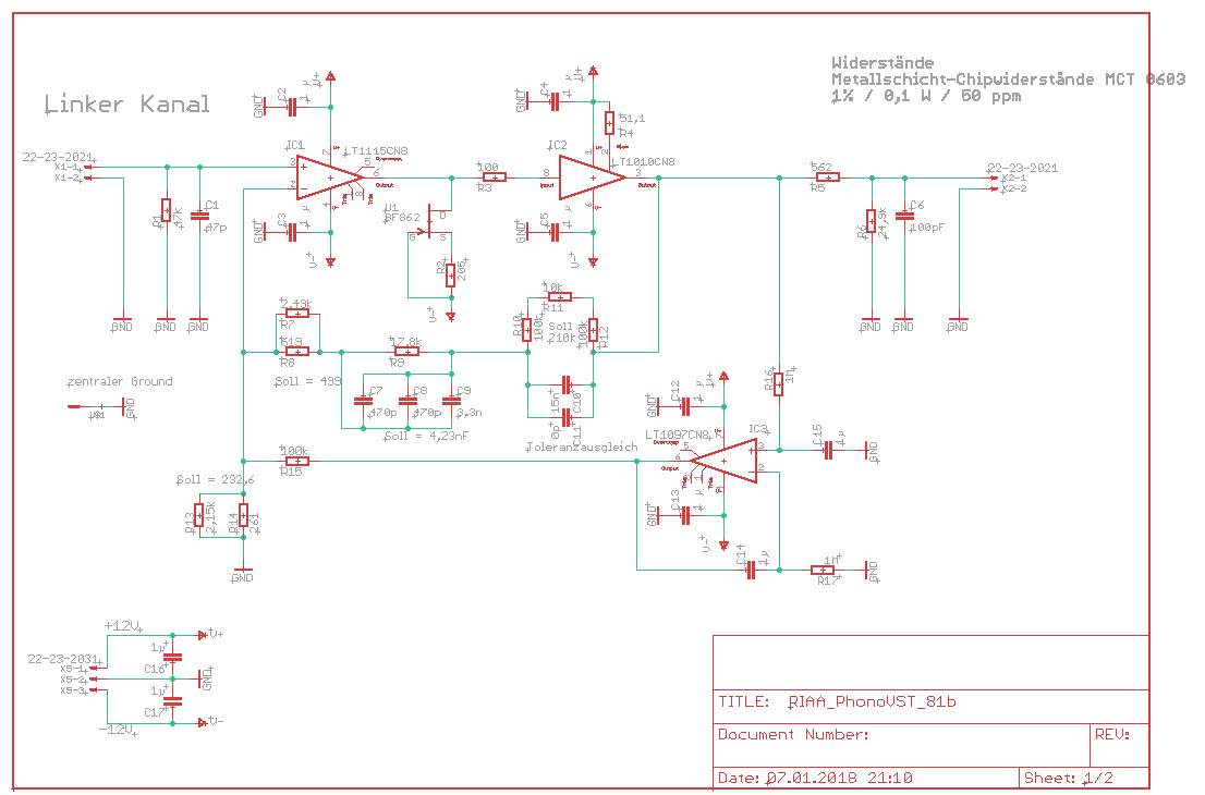 Hallo, Schaltungstechnisch sieht das erstmal okay aus. Wobei die Kombination 470 uF + 10 uF + 100 nF zu überdenken wäre. Die 10 uF würde ich weg lassen und die 100 nF gegen 1 uF Kerko tauschen. Die Störunterdrückung wird besser sein und Du sparst 4 Elkos ein. Das wird dann aber definitiv ein SMD-Kerko werden. Nun zum Layout: Gruselig! ;) Sternmasse ist ja schön und gut, aber Deine Masseleitungen in Spinnenform haben viel zu viel Induktivität! Da die Bottom-Seite sowieso nur GND ist, würde ich ein Polygon mit Namen GND um die Platine ziehen und die Ratsnest-Funktion benutzen, um das Polygon zu füllen und so eine durchgehende Massefläche zu erzeugen, die wesentlich weniger Widerstand und Induktivität als Deine Leiterzüge hat. Soll GND vom Gehäuse isoliert sein, um kapazitive Einflüsse über das Gehäuse zu vermeiden, sollten Deine Bohrungen von der Massefläche isoliert sein. Du tust auch gut daran, eine mehrpolige Schraubklemme oder Verbinder am Ausgang zu benutzen. Du wirst den GND und auch die Spannungen auch in anderen Schaltungsteilen brauchen, also solltest Du wenigstens 2 Klemmen pro Leitung vorsehen, eher mehr. Ansonsten haben moderne OPVs ein PSRR > 110 db, manchmal auch 120 db. Da ist Deine Stromversorgung nahezu egal. Mein Hifi-Vorverstärker arbeitet mit einem Schaltnetzteil 12 V mit 15 W und die symmetrische Versorgungsspannung erzeuge ich mit einem DC/DC-Wandler von Traco Power mit nachfolgender (vermutlich nicht benötigter) Filterung über Gleich- und Gegentaktdrosseln und Entstörkapazitäten. - Der zusätzliche Noise durch die Stromversorgung im Audiosignal ist mit meinen nicht gerade schlechten Messmitteln nicht messbar, auch nicht die direkten Schaltfrequenzen oder deren Oberwellen durch das hohe PSRR. Viele Grüße! Sven