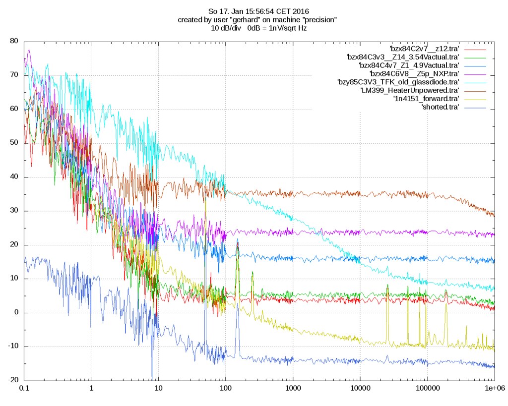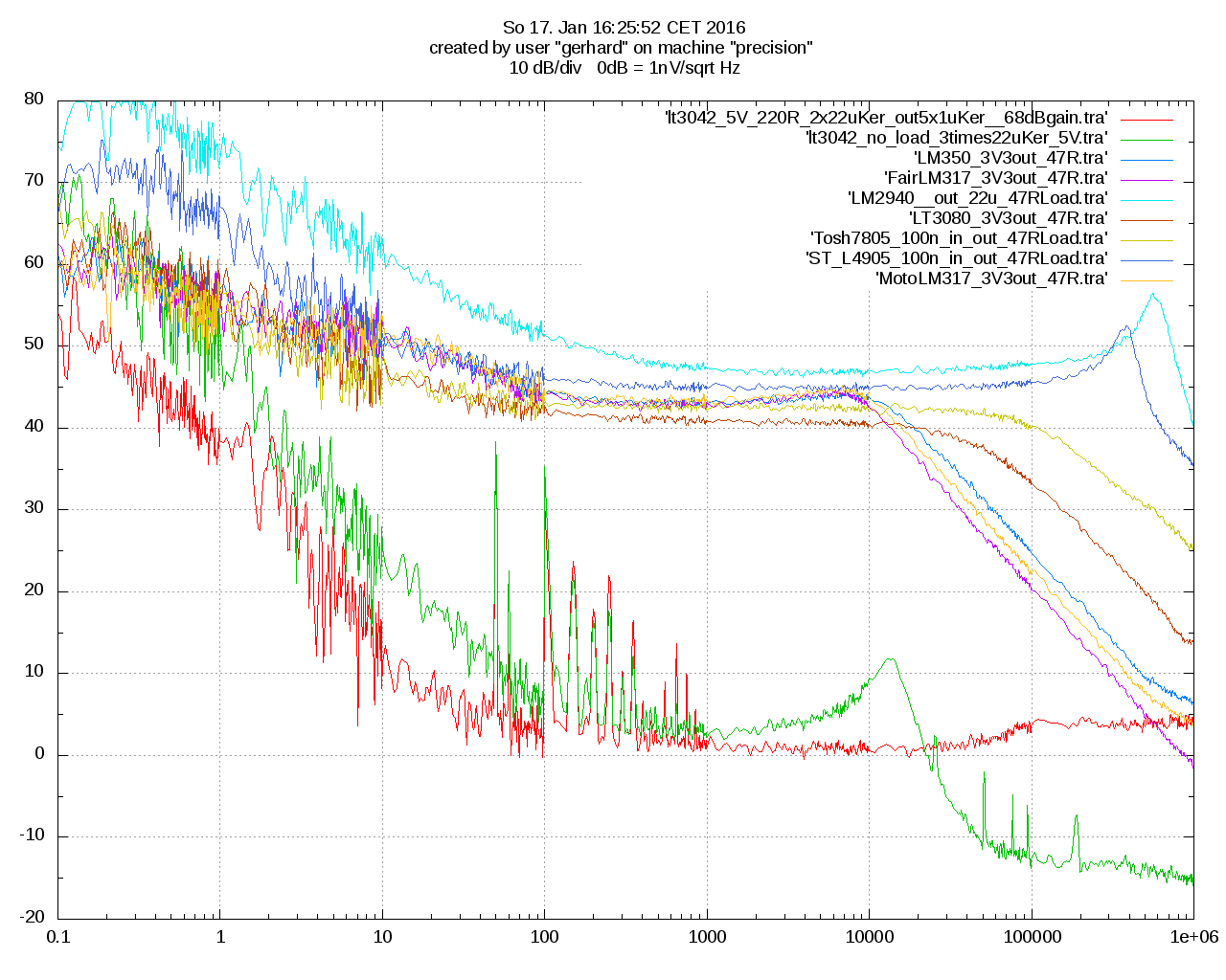 Wenn ich schon dabei bin, auch noch das Rauschen einiger Spannungsreferenzen. Die schlimmste ist die LM399, was das Rauschen angeht. Bezgl. Stabilität war sie lange Zeit das nonplusultra, mit eigenem Chip-Ofen um die Temperatur stabil zu halten. Aber BandGaps haben eben das Handicap dass sie kleine Spannungsdifferenzen verstärken müssen und das liefert schlimme Resultate beim Rauschen. Die LT6655 ist für Bandgap-Verhältnisse richtig gut. Zeners für <= 3V3 sind auch überraschend ordentlich; erst so bei 5V, wenn der Zenerdurchbruch nach Avalanche umschlägt entwickeln sie sich zum Rauschgenerator. Für die extra audiophile Schaltung erwarte ich wegen der Bandgap mit einem einzigen popeligen Filterpol kein wirklich niedriges Rauschen, zumal da noch eine Verstärkung von 2.5 auf 16V vorhanden ist. Auf diyaudio.com gibt es einen Megathread über LM317 + Rauschverbesserer mit teilweise recht barocken Lösungen und dem üblichen Rumgehacke. Bin jetzt aber zu faul zum Suchen. OK, < https://www.diyaudio.com/community/threads/d-noizator-a-magic-active-noise-canceller-to-retrofit-upgrade-any-317-based-vreg.331491/ > Geht mittlerweile über 169 Seiten. Gerhard sorry, für die Farbgebung bei gnuplot kann ich nix.