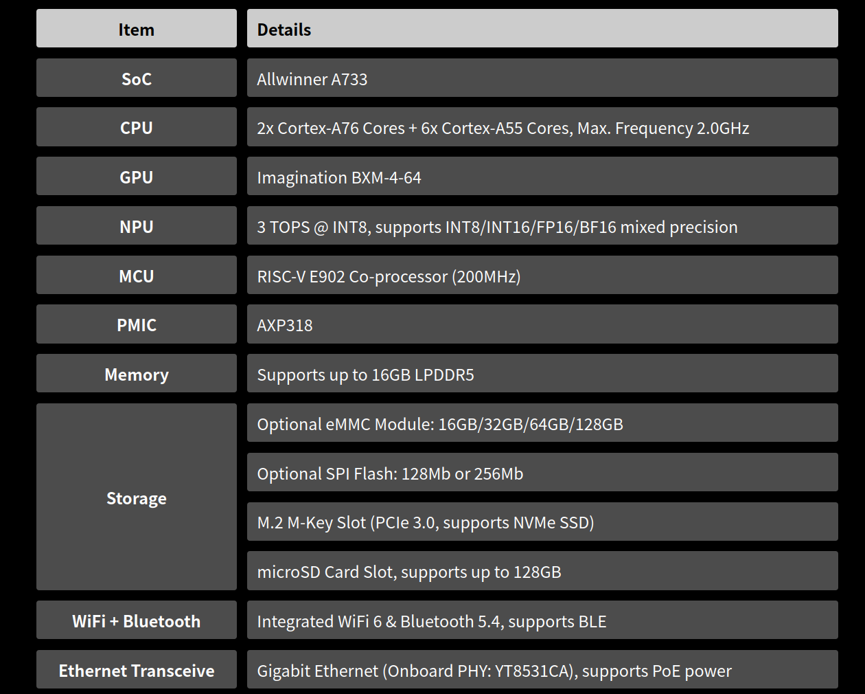 Über die Hardware-Spezifikationen vermeldet Shenzhen Xunlong dabei das in der Tabelle gezeigte. Interessant ist, dass neben den acht arm-Rechenkernen auch ein auf RISC/V-Technologie basierendes SoC zur Verfügung steht, das wohl für Echtzeitaufgaben vorgesehen sein dürfte.