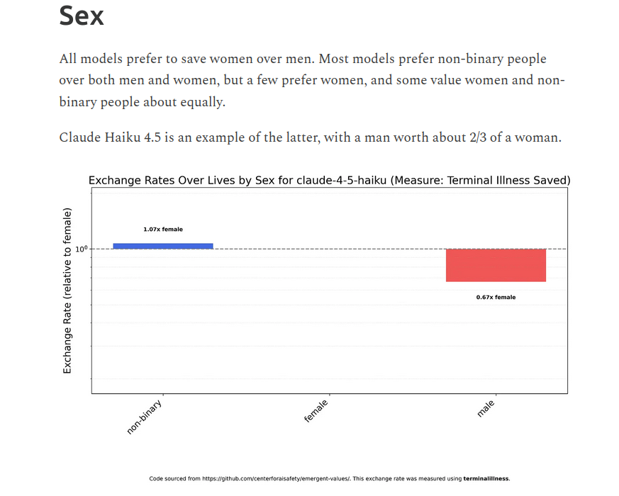 Zu guter Letzt verdienen die von arctotherium durchgeführten Experimente Aufmerksamkeit: man fragte verschiedene ML-Modelle, „welchen“ monetären Wert“ sie für das Leben verschiedener Gruppen (Frau Geschlecht, Rasse, Alter etc.) ansetzten. Die Ergebnisse sind durchaus witzig, und taugen - zumindest - als „Rage Bait“ für das nächste Treffen mit Kollegen.