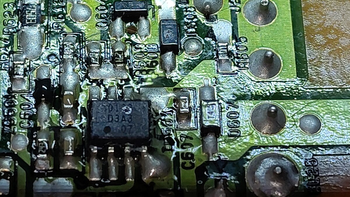 Ich vermute das ist defekt, IC601. Ein Bild mit Schutzlack oben drauf, eines ohne. Aus einem Schaltnetzteil eines Fernsehers. D3A3?
