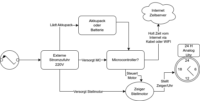 Hallo. Ich hab eine Idee zu einer Micocontroller-Analog-Digital Uhr und habe aber keine Ahnung ob das was Ich mir ausgedacht habe überhaupt möglich ist. Die angehängte Datei "Micocontroller-Analog-Digital.drawio.png" zeigt die Idee, welche Ich hier beschreibe. Die 24-Stunden Uhr soll von einem $COMPUTER mittels einem Stellwerk gesteuert werden. Im Normalbetrieb soll der Strom von der Steckdose kommen und bei einer Stromunterbrechung soll das AkkuPack oder die Batterie die Versorgung des $COMPUTERS und des Stellwerks übernehmen. HW technisch bin ich sehr Neuling. SW kann Ich etwas programmieren. Die Fragen die sich mir stellen: * Ist die Idee in "endlicher" Zeit umsetzbar. Ich meine damit nicht das es ein Lebenswerck ist :-) * Was würde so ein Projekt kosten? Danke fürs lesen und feedback. LG Alex