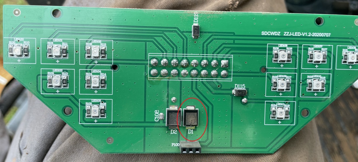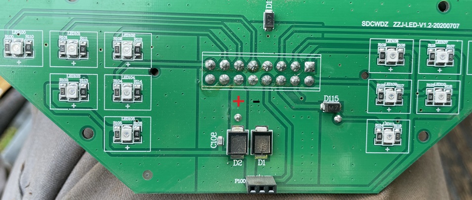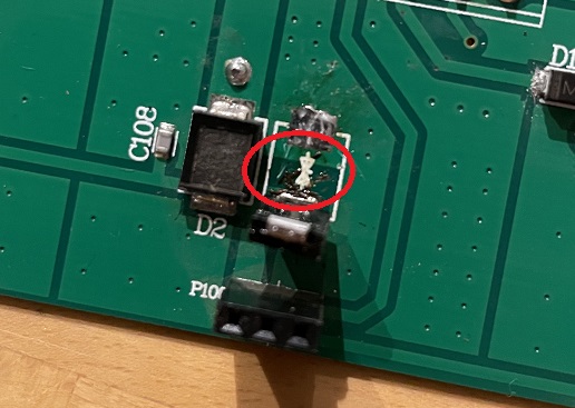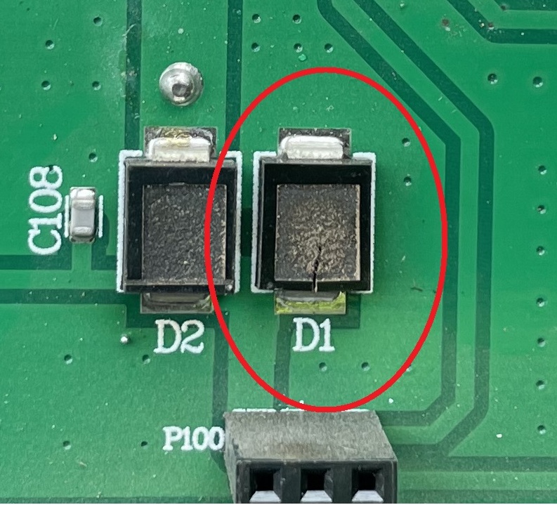 Danke für eure Infos :-) Nochmal zurück zur Schaltung: Wenn ich das Platinenlayout richtig deute, dann liegt die Diode D2 in Reihe zum Pluspol. Parallel zum Pluspol gegen Masse liegt Diode D1. Könnte D1 eine TVS-Diode sein, die dann wegen Überspannung einfach zerstört wurde? Könnte der linke Kondensator C108 noch dazugehören und zur Glättung dienen?
