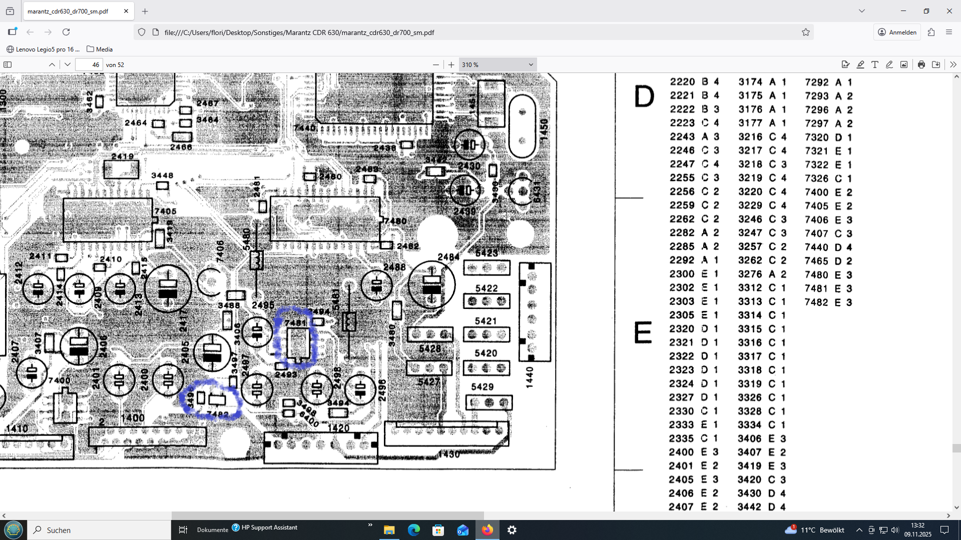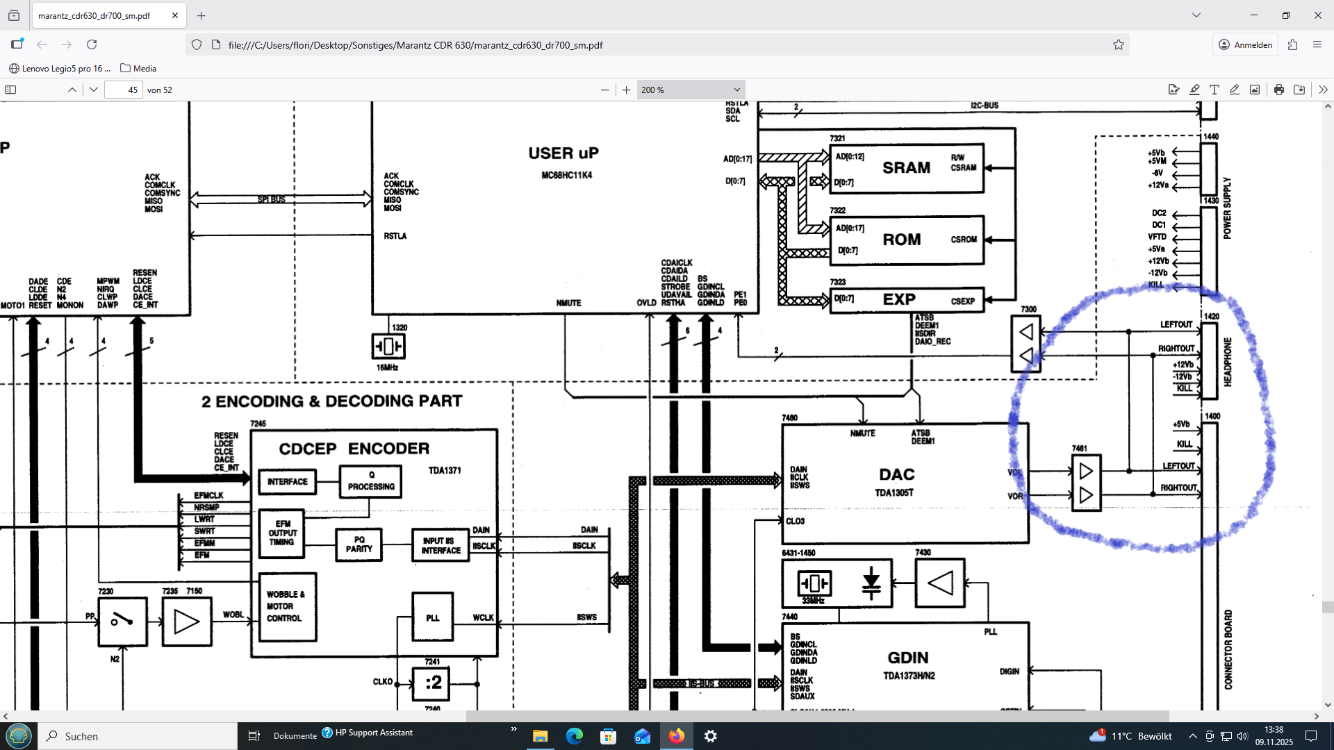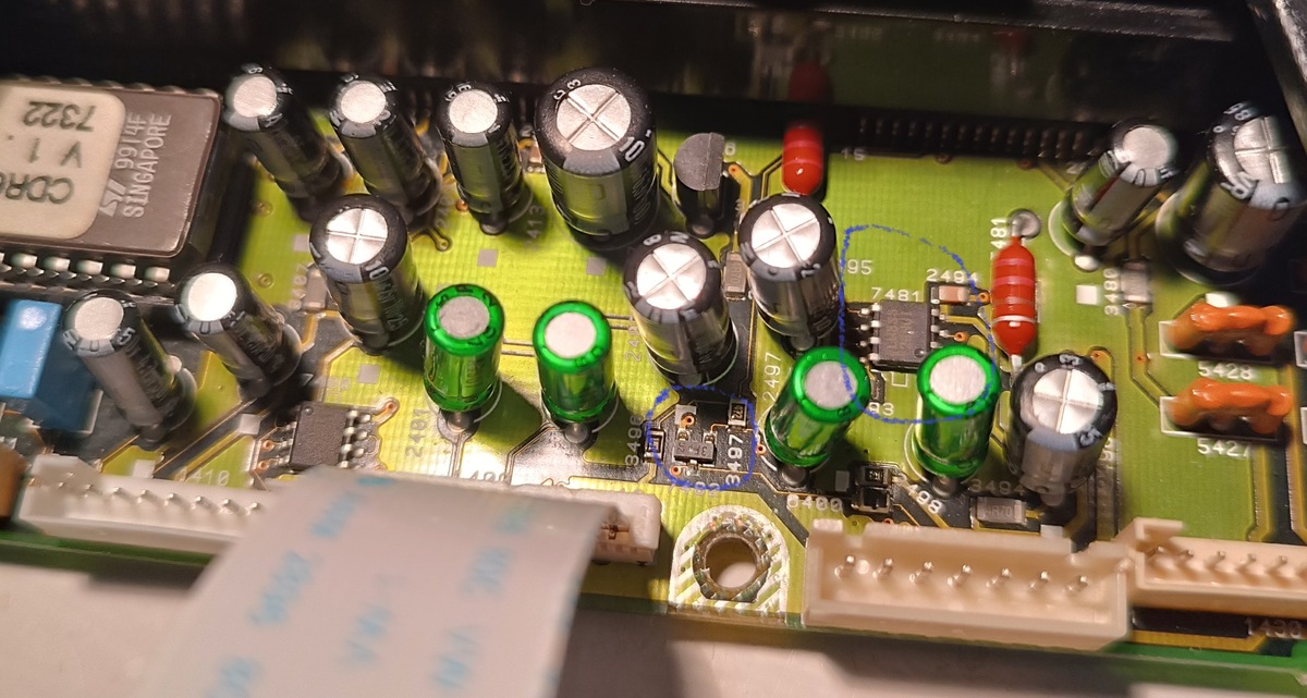 Hallo, ersteinmal vielen Dank für die vielen hilfreichen Antworten. Ich komme leider erst jetzt dazu, diese gründlich zu lesen, und zu antworten. Die spärliche Dokumentation des Laufwerkes (CDL3610-1) im „Service Manual“ ist vermutlich Urheberschutzechten geschuldet, daher auch der verjährte Hinweis auf die Reparaturmöglichkeit durch Philips selber. Das galt sicher vor 25 Jahren. Heutzutage ist aber leider der Support durch Marantz und Philips nicht mehr gegeben (schon vor 10 Jahren erhielt ich auf eine Anfrage bei der deutschen Niederlassung von Marantz hin den Hinweis, dass keine Originalersatzeile für dieses Gerät mehr lieferbar seien). Anhang 1 zeigt die Signalführung nach der D/A-Wandlung leider nur unvollständig: es ist ersichtlich, dass Bauteil 7481 (Treiber?) das Signal stereo an des Connectorboard (Header 1400) und das Headphoneboard (Header 1410) leitet. Was es mit Transistor (?) 7482 auf sich hat, erschließt sich mir jedoch nicht. Dieser und 7481 sind auf Anhang 2 gekennzeichnet. Dieser zeigt auch den Zustand der Elkos, die noch nicht aufgebläht sind. Anhänge 3 + 4 zeigen wiederum die Signalführung, (für mich leider unverständlich). Ich habe mir ein Oszilloskop mit Signalgenerator besorgt, und werde versuchen, das Signal vom D/A-Wandler aus zu verfolgen (habe ich noch nie gemacht, das dauert bestimmt seine Zeit). Grüße, flori54
