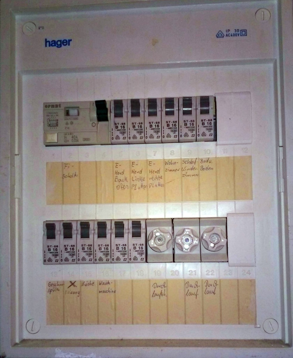 Moin, weil wir ja gerade im Nachbarthread einen Sicherungskasten sezieren, habe ich mir mal die Photos von unserem vorgenommen, die ich irgendwann mal vor 10 Jahren gemacht habe kurz nach dem Kauf. Das Haus ist BJ1992/93, trotzdem erscheint mir der Sicherungskasten auch schon für damalige Zeiten platzmäßig recht unterdimensioniert... Was mich aber immer wieder gewundert hat: Warum sind für den Durchlauferhitzer (vermutlich 21 kW) drei separate Neozed-Einsätze (35 A; D02 ⌀15) vorgesehen, statt LS-Automaten, die es durchaus als 32-er oder 35-er gibt, einfach und 3-fach? Waren es nur finanzielle Gründe? Immerin war der Bauherr Schwabe. Oder mag es auch technische Gründe gegeben haben? Bin gespannt!