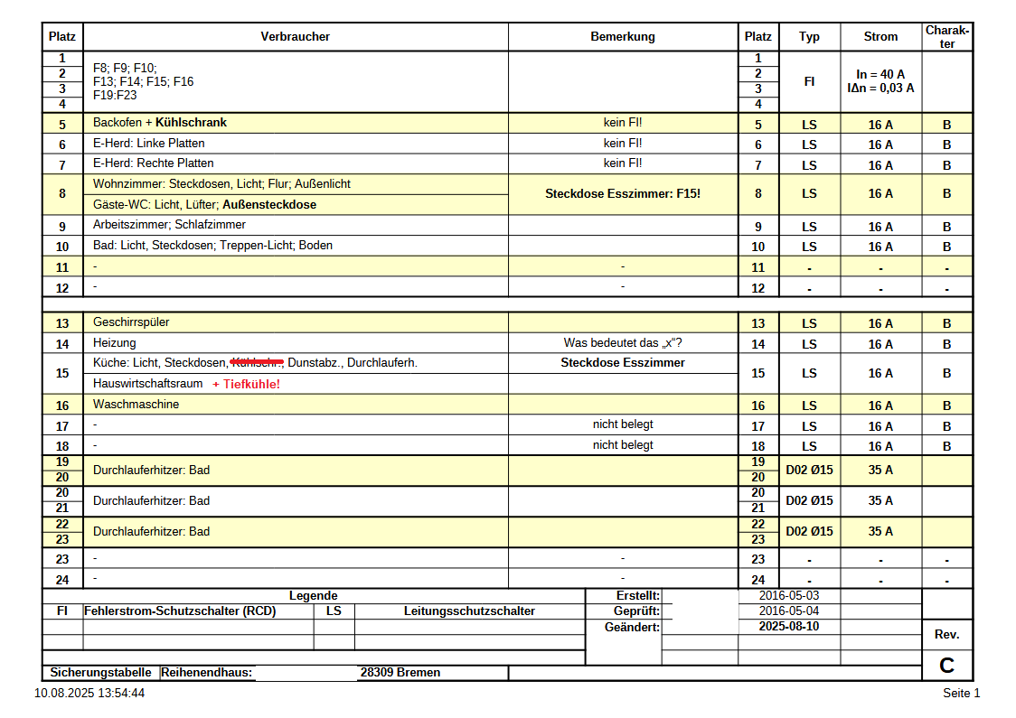 Nein, das Induktionsfeld ist in eine der Küchensteckdosen F15 eingesteckt. Auf F5 hängen Backofen und Kühlschrank dran, ohne FI übrigens, wie ich letztens rausgefunden habe. Anbei mal die komplette Belegung.