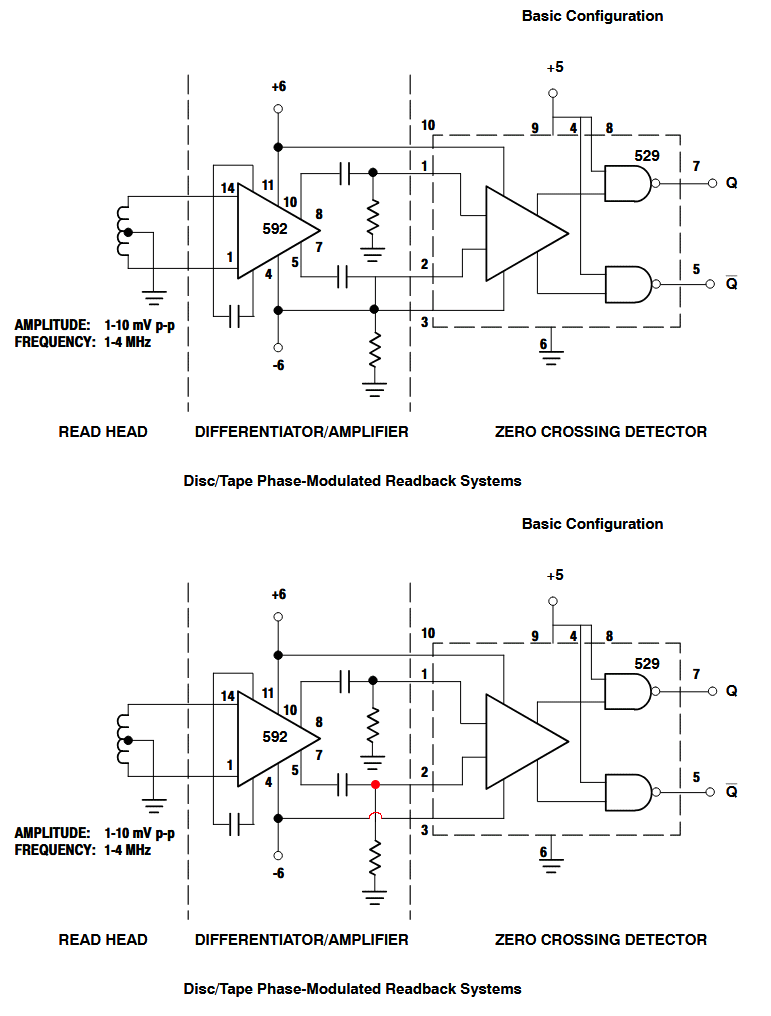 Zur Frage: Warum? Ich denke hauptsächlich aus akademischer Neugierde, ob's was bringt. Meine bisherigen Gespräche mit anderen, die Disketten aus der 1980er - 1990er Aera haben, lassen vermuten dass es trotz Kryoflux, etc, noch Bedarf zur privaten Datenrettung gibt. Und rauschärmere Verstärkung war etwas, was auch schon andere angedacht, aber meines Wissens nach noch nicht probiert haben. Sekundär: Es ist ein Projekt das mich als "Digitalmensch" schon viel über die ganze Welt zwischen null und eins gelehrt hat. Ich bin mir bewusst, dass 20Mhz 12 Bit sampling vielleicht etwas über meiner Kragenweite sind, aber wer sich keine neuen Ziele setzt kann nicht wachsen :) Ich habe mir jetzt mal NE592 bestellt, sollten die Tage eintrudeln. Dann werde ich weiter schauen und nochmal berichten. Eine Frage habe ich zum Datenblatt. Ich vermute einen Fehler in der Zeichnung, und habe das mal rot "korrigiert" wie ich glaube dass es sein soll. Wäre nett, wenn jemand das kurz kommentieren könnte.