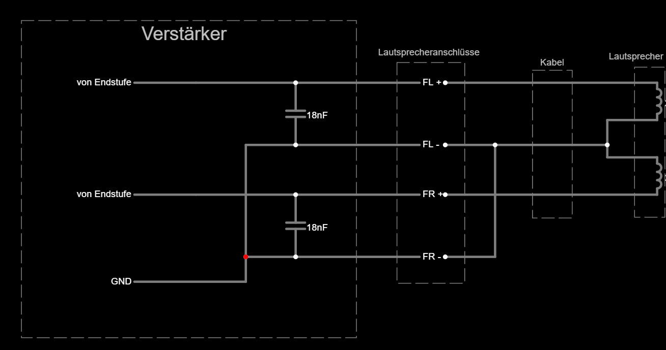 Hallo, ich möchte Aufgrund von baulichen Gegebenheiten ein möglichst dünnes Kabel für den Anschluss von Lautsprechern an einen AV-Receiver verwenden. Mir kam die Idee ein geschirmtes Kabel dafür herzunehmen und den Schirm als gemeinsamen Minus-Pol für die Lautsprecher zu verwenden -> in meinem Fall für vier Lautsprecher ein 4x1mm² mit Schirm, dieser hat ca. 2,5mm². Im Schaltplan des Verstärkers befindet sich nach dem gemeinsamen GND der Lautsprecheranschlüsse noch je Ausgang ein Kondensator. Nun stelle ich mir die Frage was den der Kondensator dort für eine Funktion hat und ob die Verschiebung des gemeinsamen Massepunktes ein Problem erzeugen könnte? Hab das mal versucht zu veranschaulichen... Vielen Dank für eure Hilfe!
