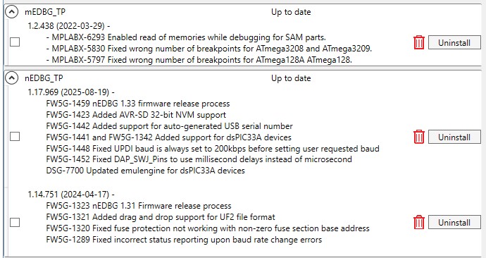 Hallo, Bsp. an meinem AVR128DB48 Curiosity Nano nEDBG_TP.1.17.969.atpack Ich verwende für mich Variante 2, wenn es notwendig sein sollte. Ist übrigens das gleiche Vorgehen für ein Atmel IC Update o.ä. Du beachtest bitte für dich nEDBG bzw. mEDBG. :-) Anleitung liest sich komplizierter wie es ist. Sind am Ende nur paar Klicks. :-) ---------------------------- Microchip Studio 7 > View > Available Microchip Tools auf nEDBG Rechtsklick > Upgrade (ist nur erstmal Anzeige der Version) v1.21 on Tool und v1.21 on Disk ------------------------------------------- Update Variante 1 wie folgt je nachdem was man benötigt von hier runterscrollen und runterladen https://packs.download.microchip.com/ Die komischen Bezeichungen dürfen einem nicht ablenken. für mEDBG >> mEDBG support (aktuell 1.2.438) für nEDBG >> PKOB nano support (aktuell 1.17.969) je nachdem liegen dann diese Dateien auf dem Rechner vor- Microchip.mEDBG_TP.1.2.438.atpack Microchip.nEDBG_TP.1.17.969.atpack Ein Doppelklick auf die Datei installiert das Update auf den Rechner bzw. für Microchip Studio. Dann sollte es theoretisch für ein Upgrade unter Microchip Studio 7 > View > Available Microchip Tools zur Verfügung stehen bzw. beim anstecken automatisch angeboten werden, dass Update. Tut es bei mir aber schon lange nicht mehr. Deswegen Nachhilfe mit Variante 2. ------------------------------------------- Update Variante 2 wie folgt je nachdem was man benötigt von hier runterscrollen und runterladen https://packs.download.microchip.com/ Die komische Bezeichungen darf einem nicht ablenken. für mEDBG >> mEDBG support (aktuell 1.2.438) für nEDBG >> PKOB nano support (aktuell 1.17.969) je nachdem liegen dann diese Dateien auf dem Rechner vor Microchip.mEDBG_TP.1.2.438.atpack Microchip.nEDBG_TP.1.17.969.atpack Bsp. an meinem AVR128DB48 Curiosity Nano nEDBG_TP.1.17.969.atpack der Datei ein .zip anhängen und entpacken. Daraus die Datei nedbg_fw.zip nedbg.XML device_support.XML wobei nur nedbg_fw.zip notwendig sein sollte nach C:\Program Files (x86)\Atmel\Studio\7.0\tools\nEDBG kopieren (analog C:\Program Files (x86)\Atmel\Studio\7.0\tools\mEDBG) und gleiches Spiel in Microchip Studio, View > Available Microchip Tools auf nEDBG Rechtsklick > Upgrade jetzt sollte unter 'on Disk' eine neuere Version angezeigt werden, wenn ja, nächsten Upgrade Button drücken ------------------------------------------- Update Variante 3 für Terminal Liebhaber wie folgt ausgepackte nedbg_fw.zip Datei nach C:\Program Files (x86)\Atmel\Studio\7.0\atbackend kopieren. Hier liegt auch das Tool atfw.exe. atfw -l (listet erkannte Boards u.ä. auf) Name merken, bei mir nedbg atfw -s (listet die Seriennummer auf) atfw -a nedbg_fw.zip -t nedbg atfw -a nedbg_fw.zip -t nedbg -s MCHP337... Ich habe bisher mit Terminal nur einmal für meinen Atmel ICE erneuert. Dafür muss das Prefix J4 vor die S/N gestellt werden. Wie das bei den µC Boards ist weiß ich nicht. -------------------------------------------